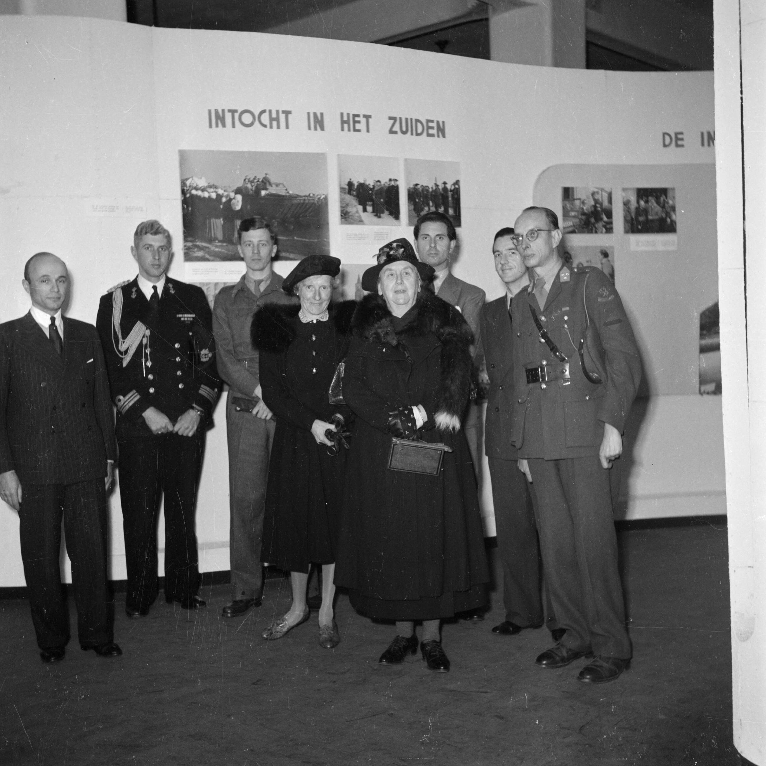 De koningin met haar gevolg en diverse autoriteiten