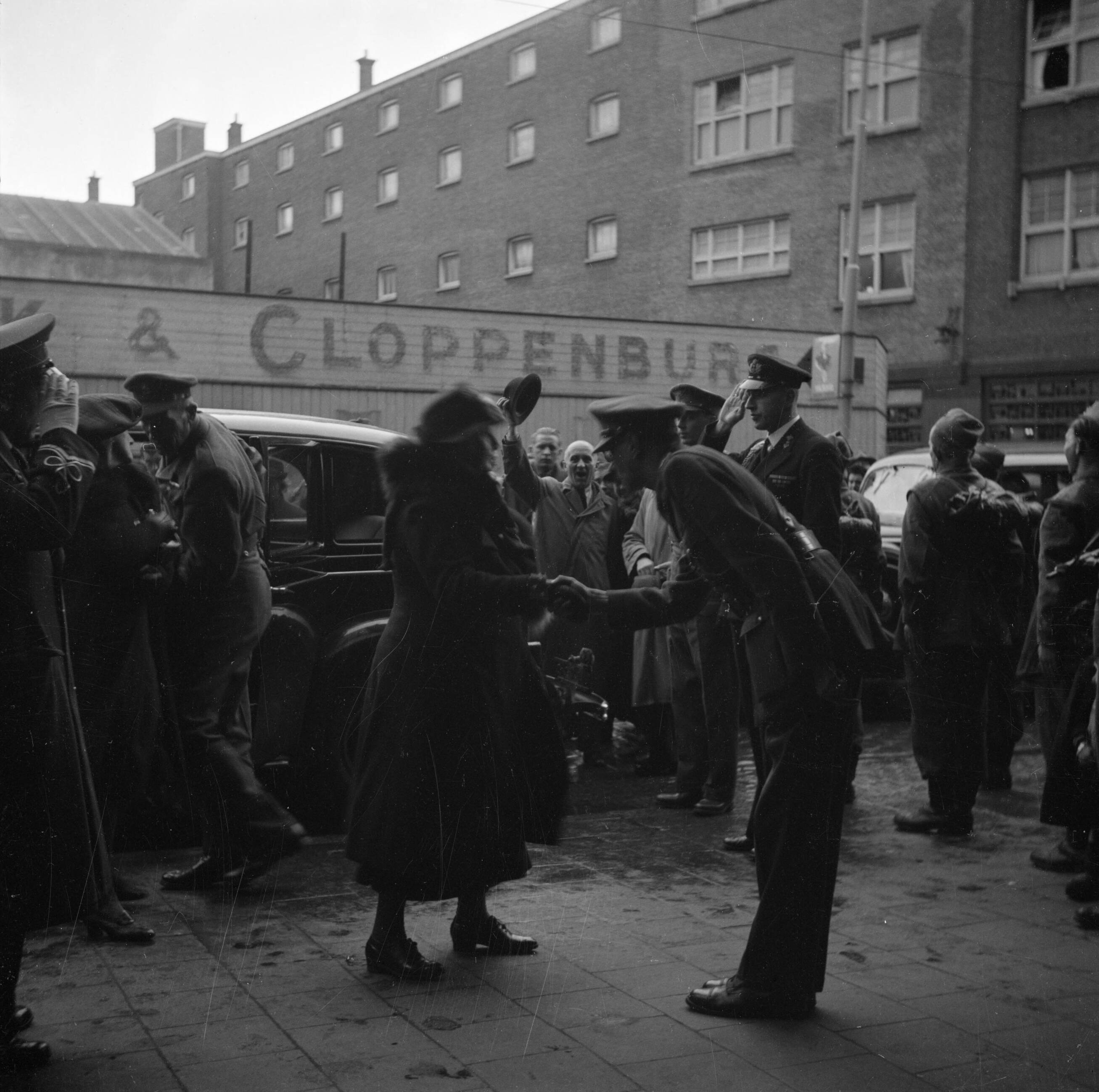 Koningin Wilhelmina wordt begroet bij aankomst bij de tentoonstelling