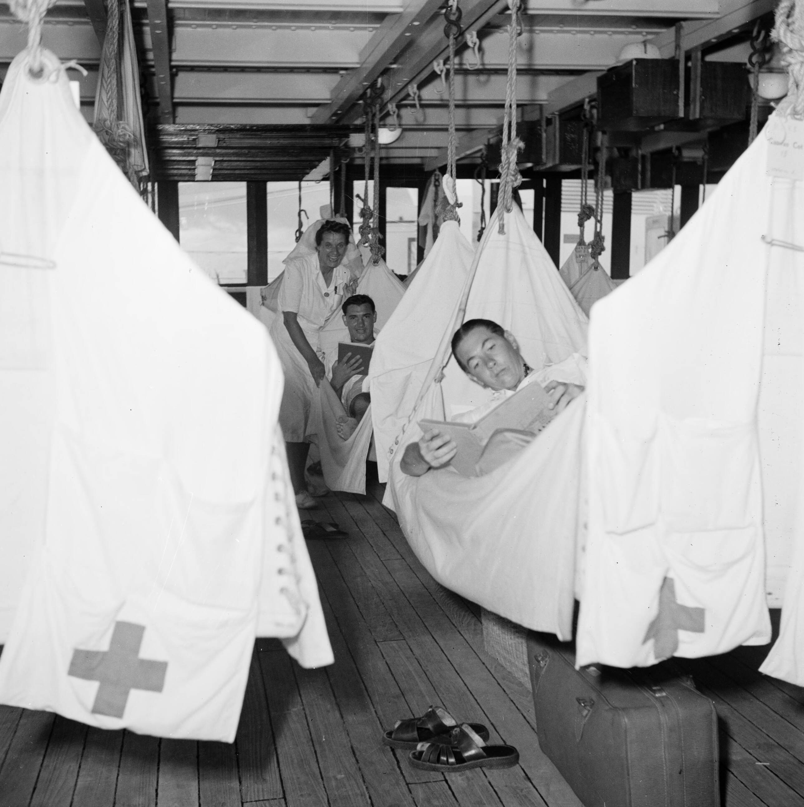 Hangmatten op het hospitaaldek van het MS "Oranje"