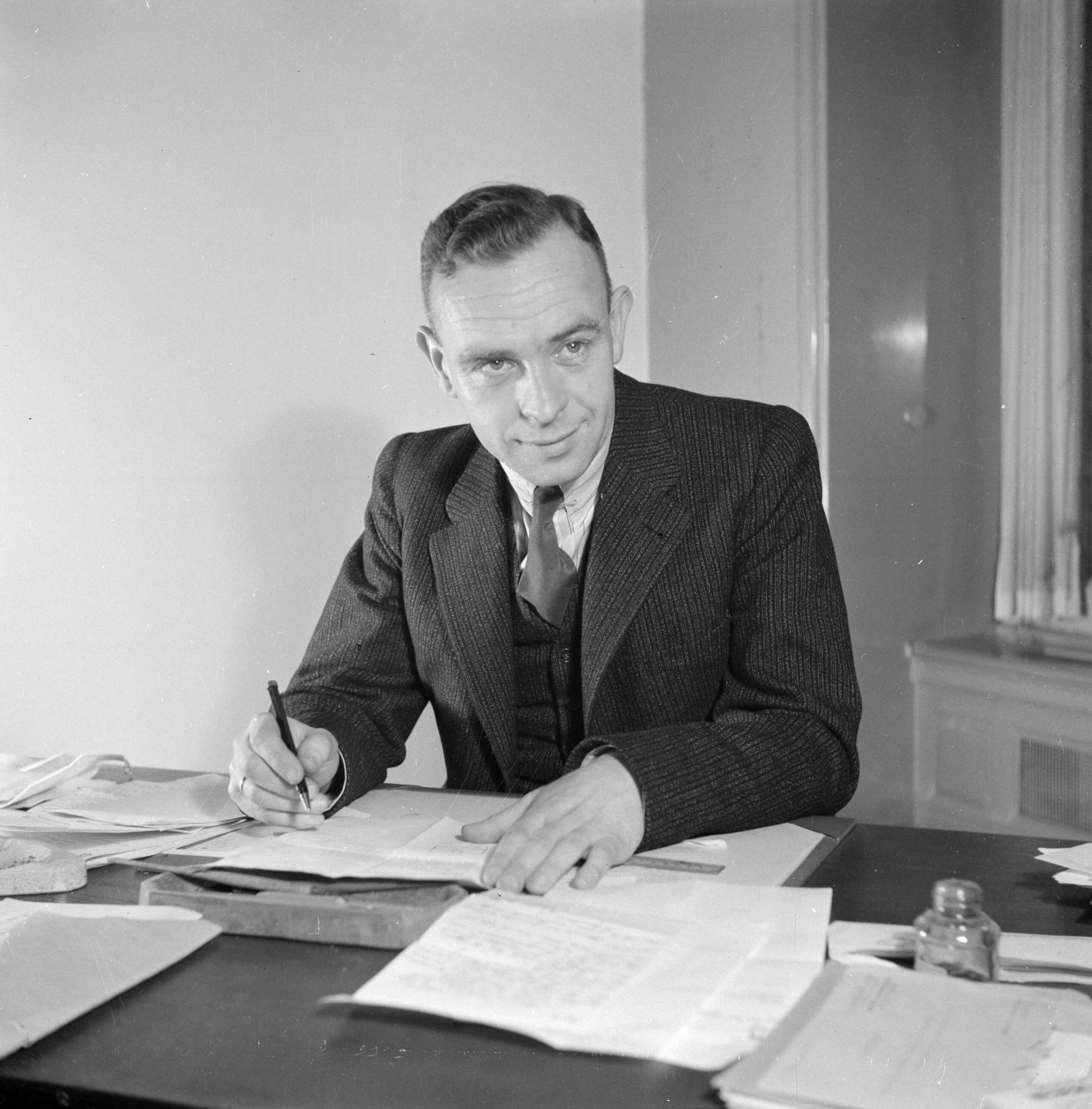 Portret van een onbekende politicus of ambtenaar achter zijn schrijfbureau