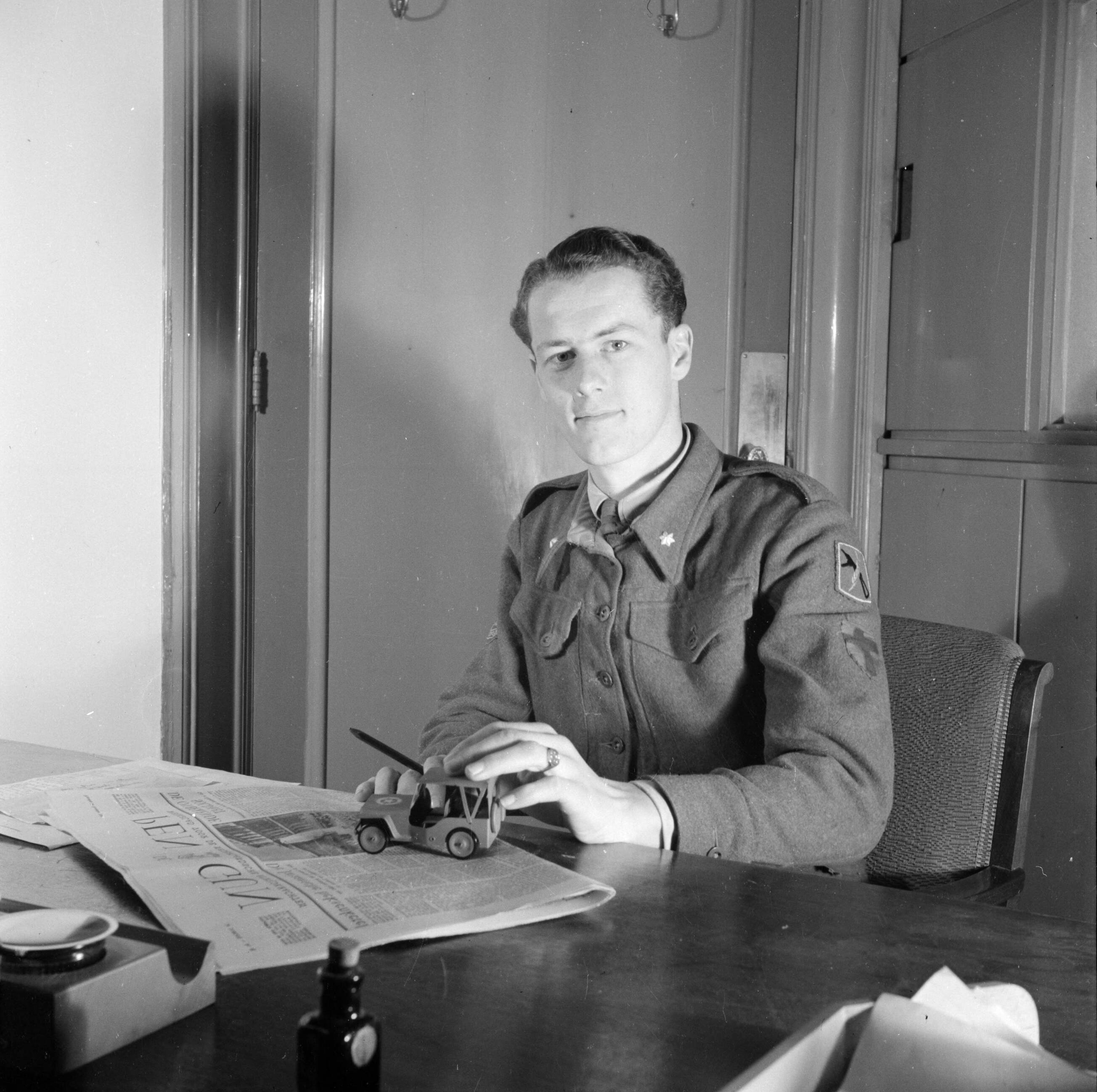 Portret van een 2e luitenant van de staf van prins Bernhard met een schaalmodel van een Jeep en een editie van "Pen Gun"
