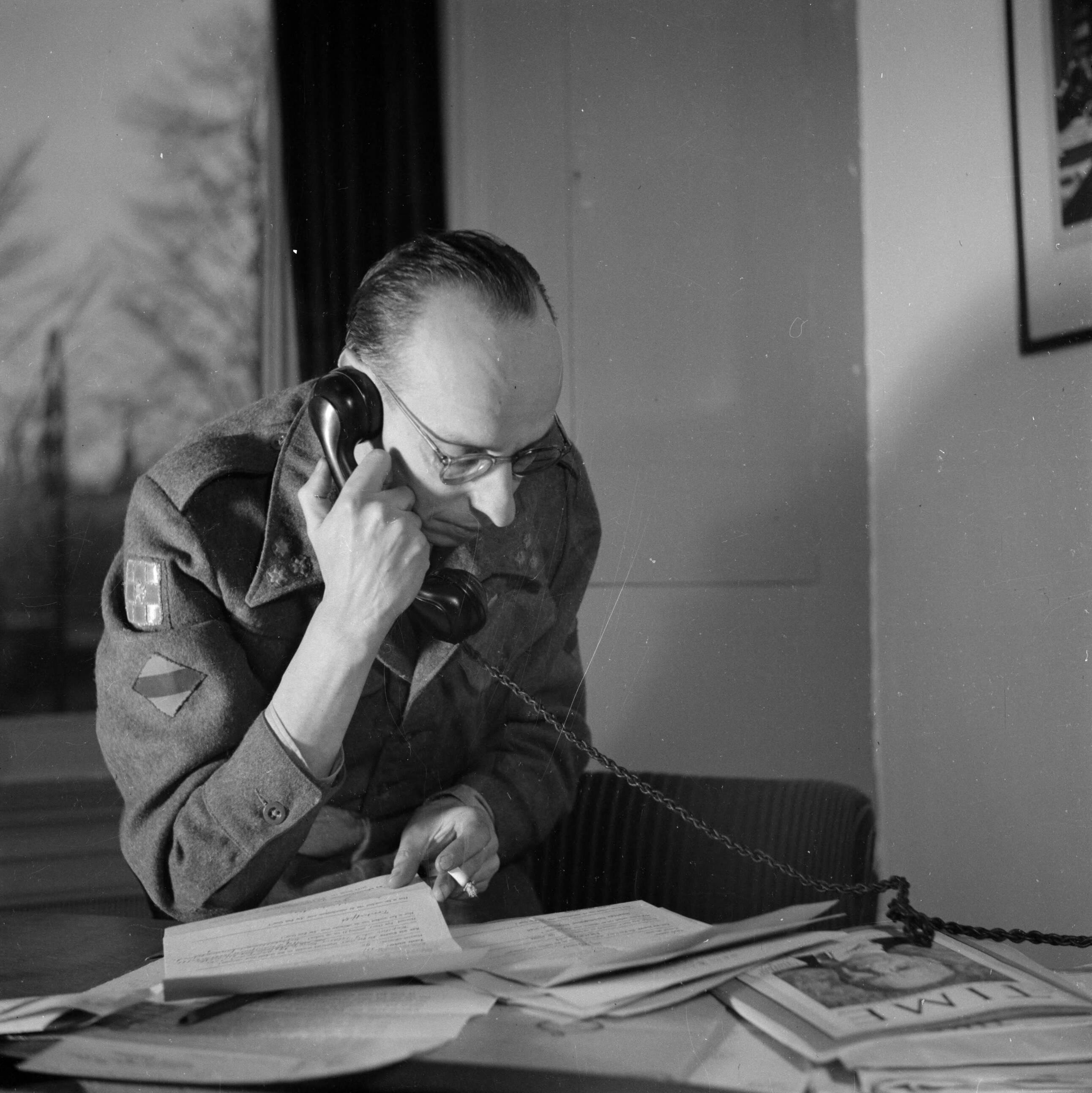 Portret van een kapitein van de staf van prins Bernhard, telefonerend, rechts ligt het tijdschrift "Time"