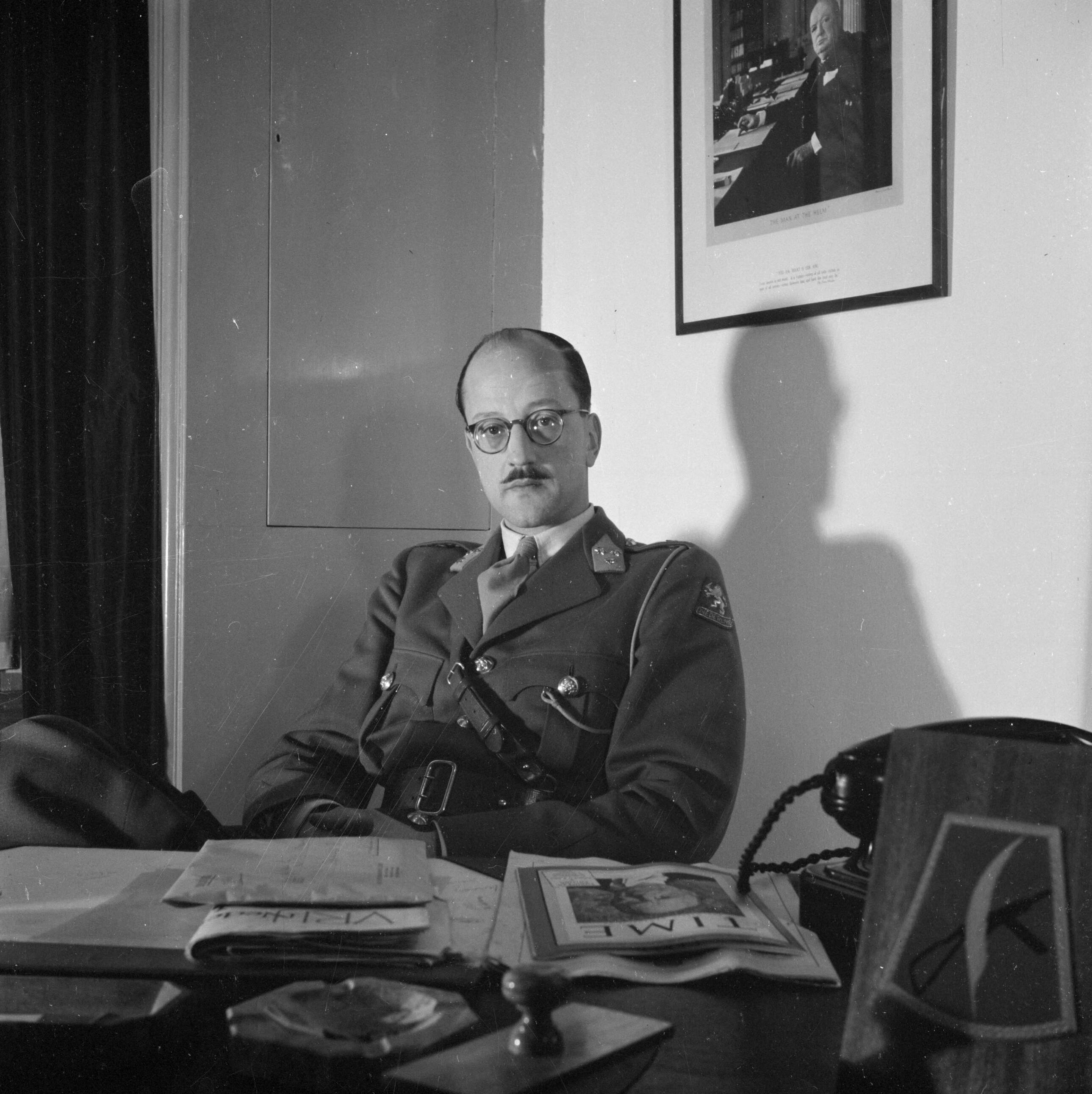 Gerrie van Maasdijk in kapiteinsuniform, verbonden aan de staf van Prins Bernhard met op zijn bureau het weekblad Time