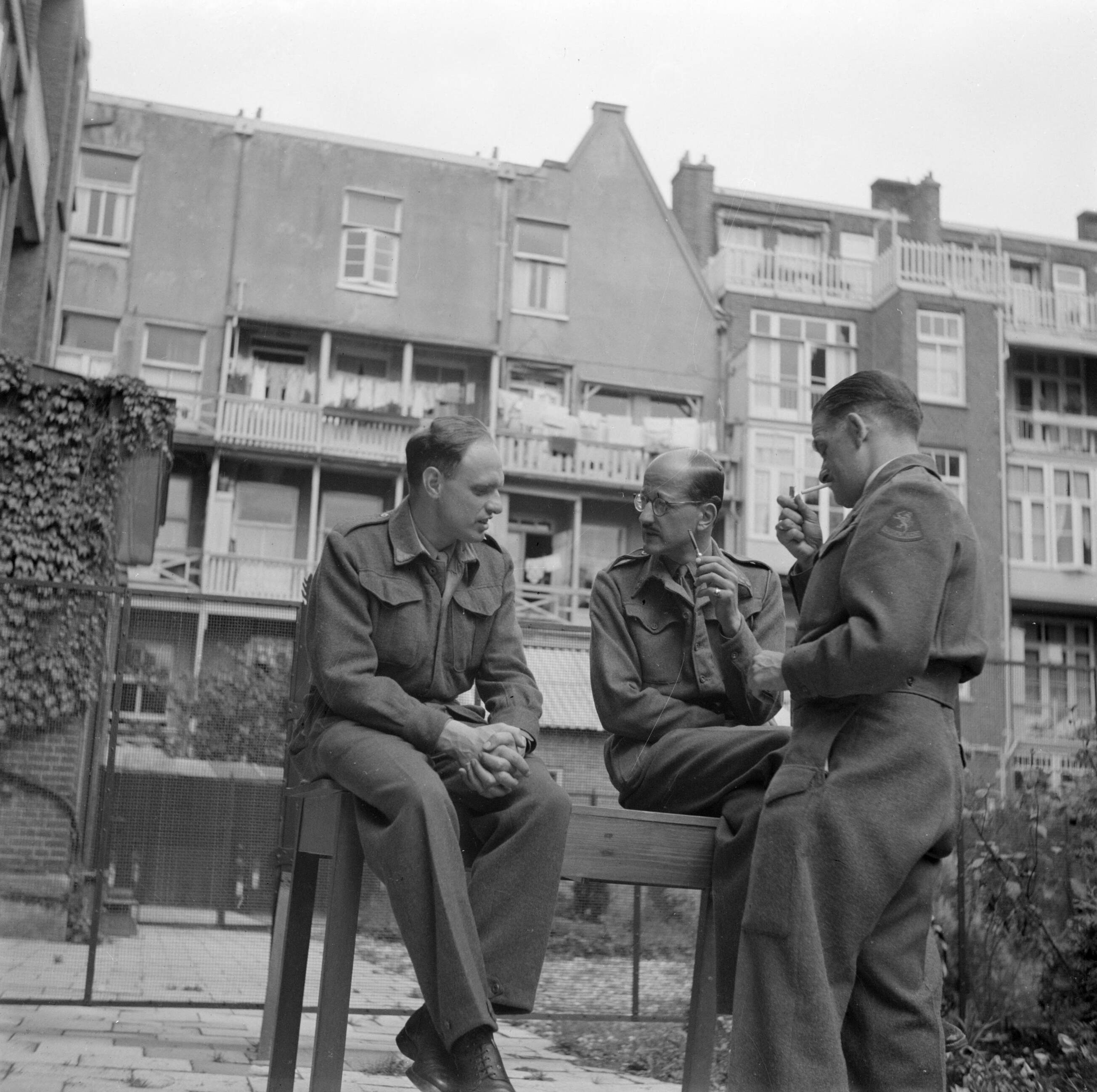 Bespreking tussen diverse militairen, waaronder Gerrie van Maasdijk (midden), van de staf van prins Bernhard