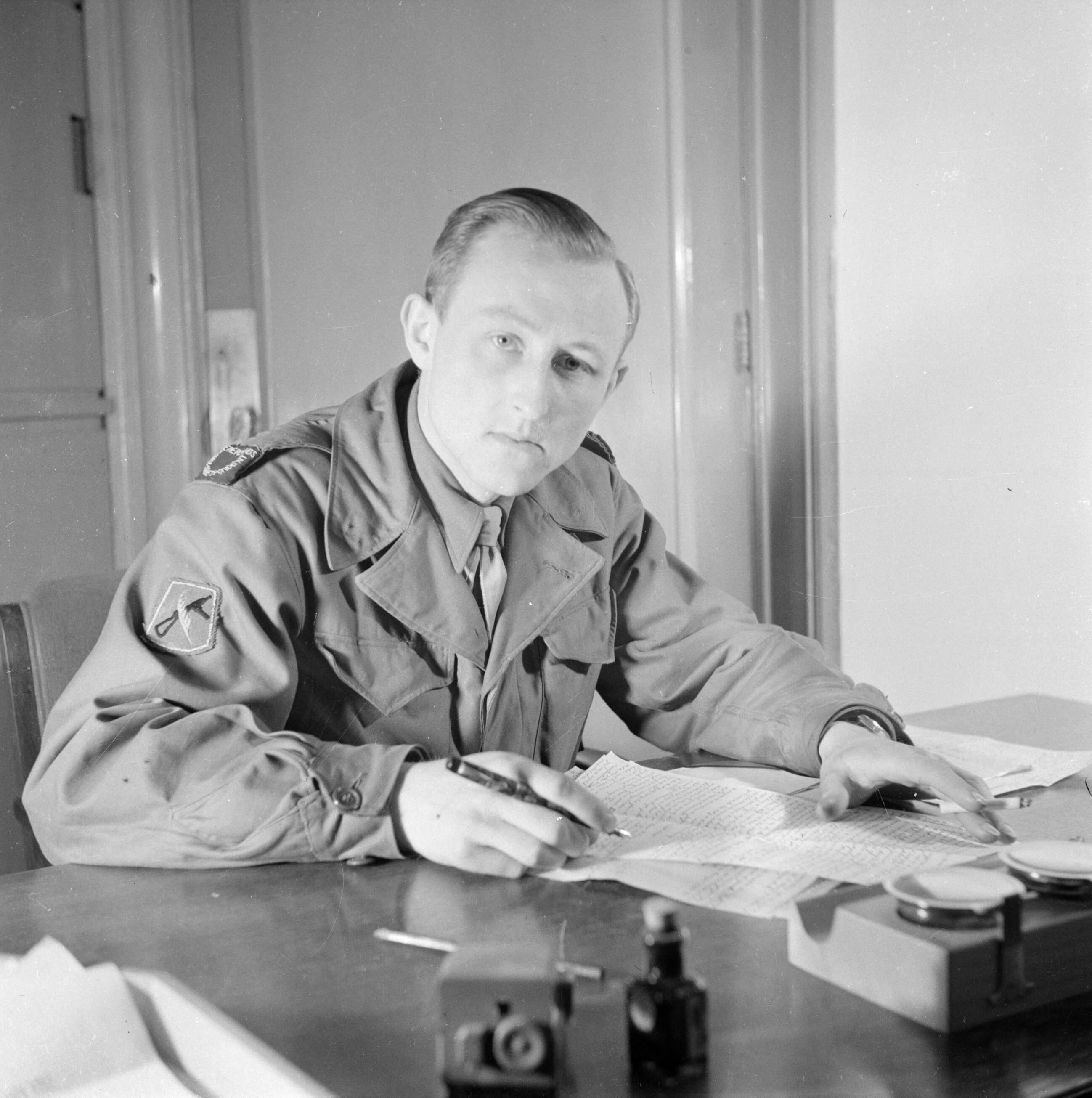Portret van een schrijvende man in een onbekend uniform zonder rangonderscheidingstekenen.
