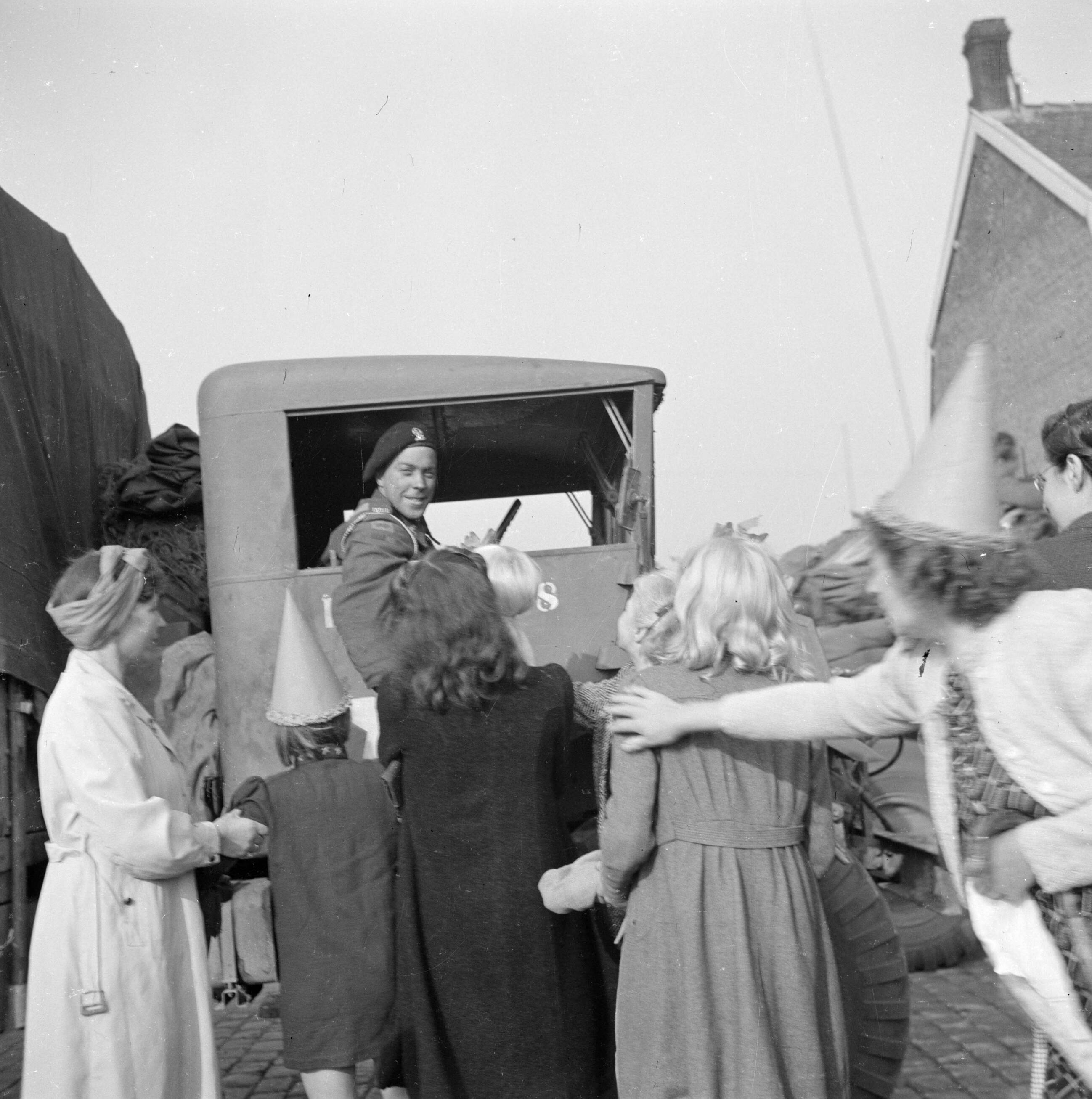Feestelijk uitgedoste inwoners van Aalst verwelkomen legereenheden van de Irish Guards