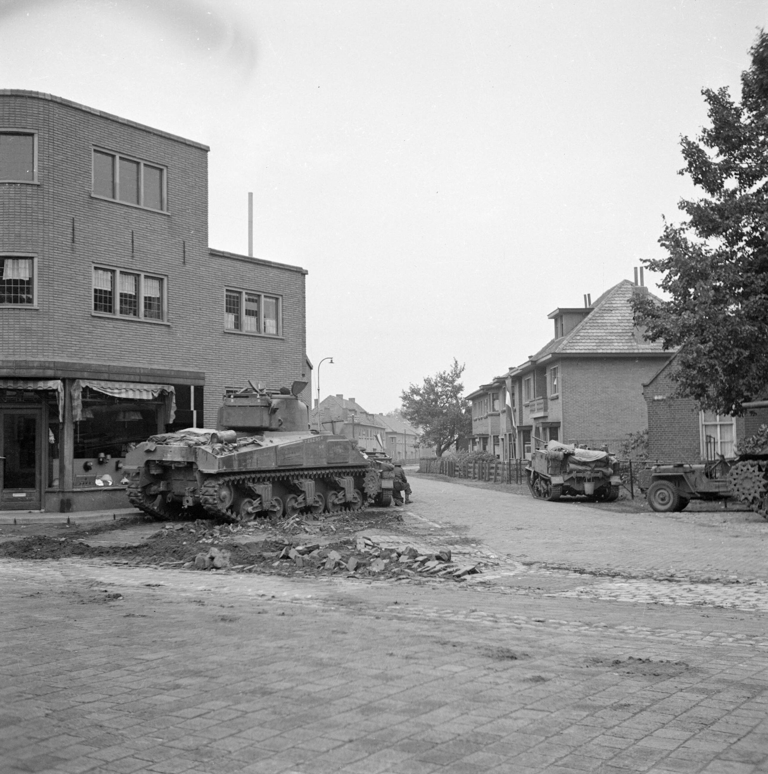 Tankeenheden van de Irish Guards nemen stelling op een kruising in Waalre