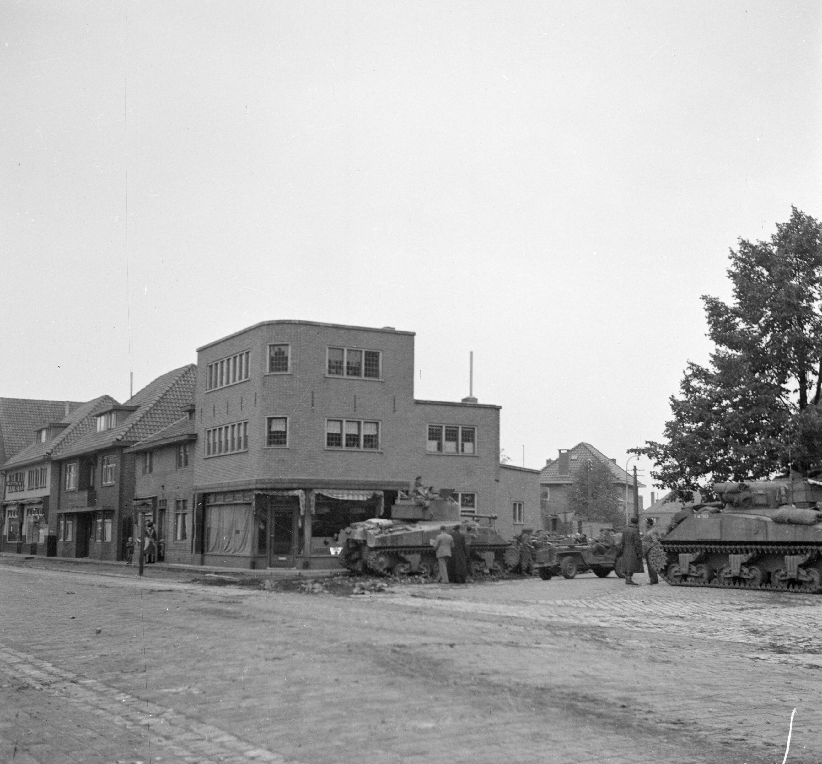 Tankeenheden van Irish Guards nemen stelling op een kruising in Aalst