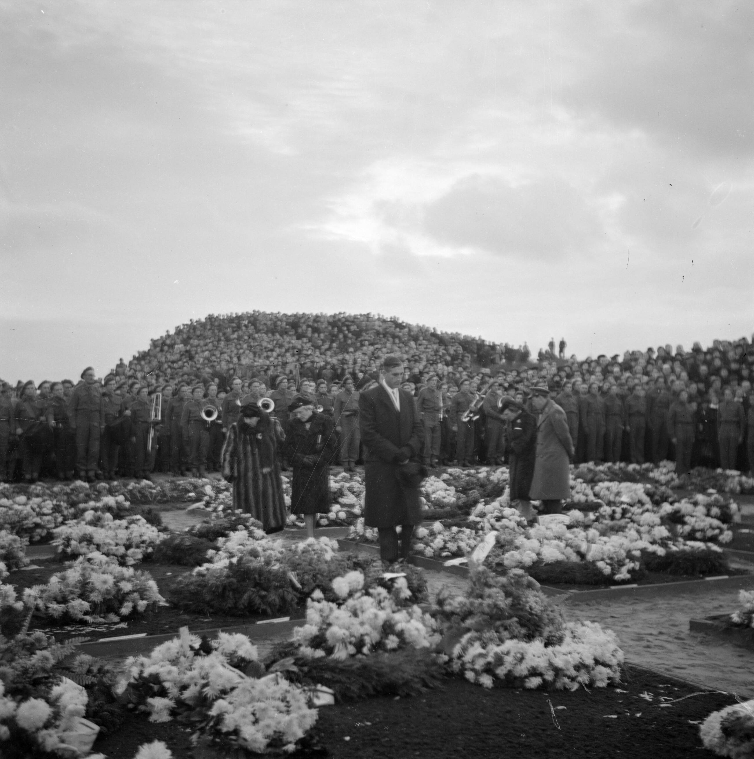 De erebegraafplaats Bloemendaal in Overveen. Koningin Juliana en prins Bernhard lopen langs de graven