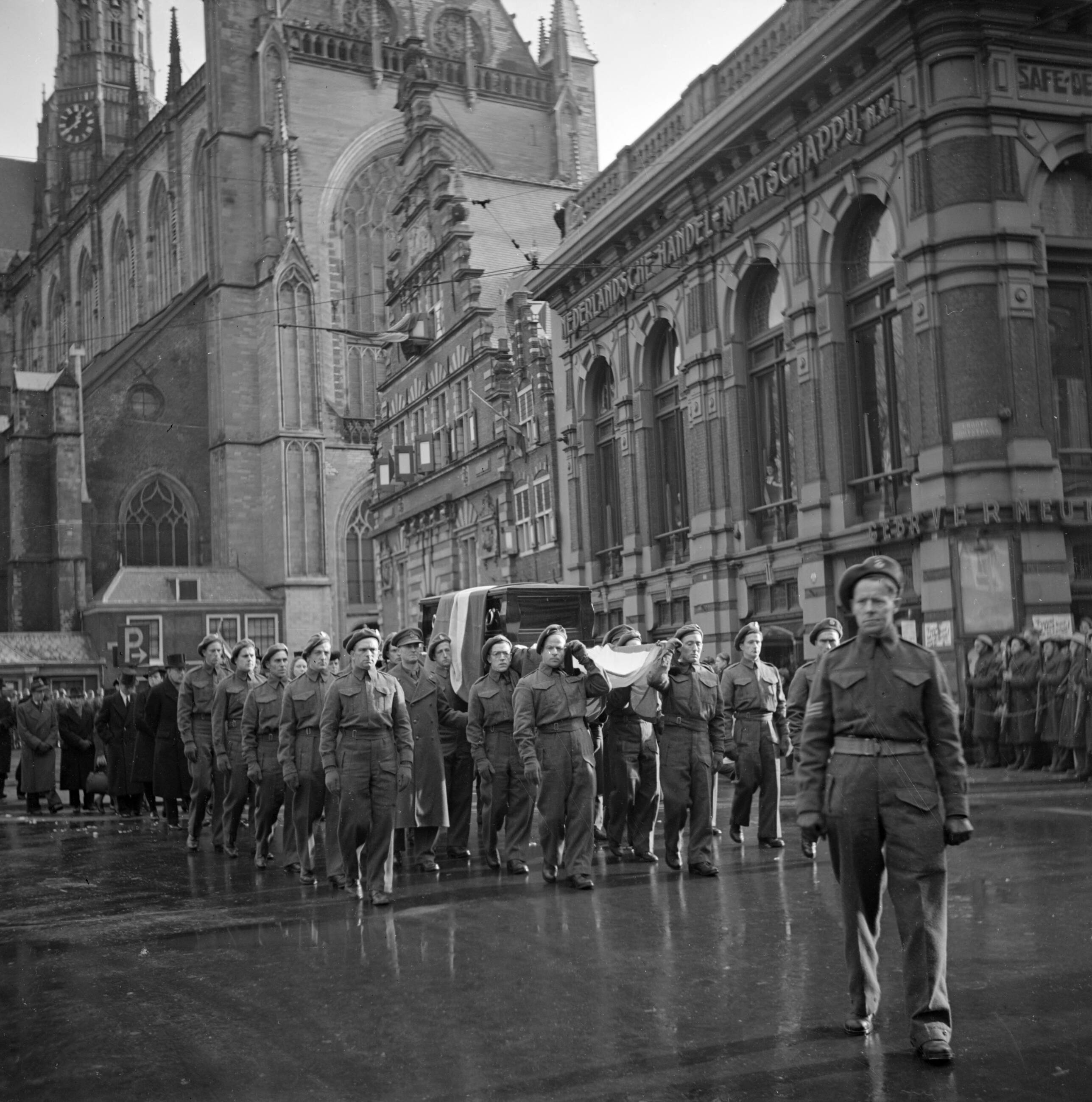 De kisten worden over de Markt in Haarlem gedragen door militairen
