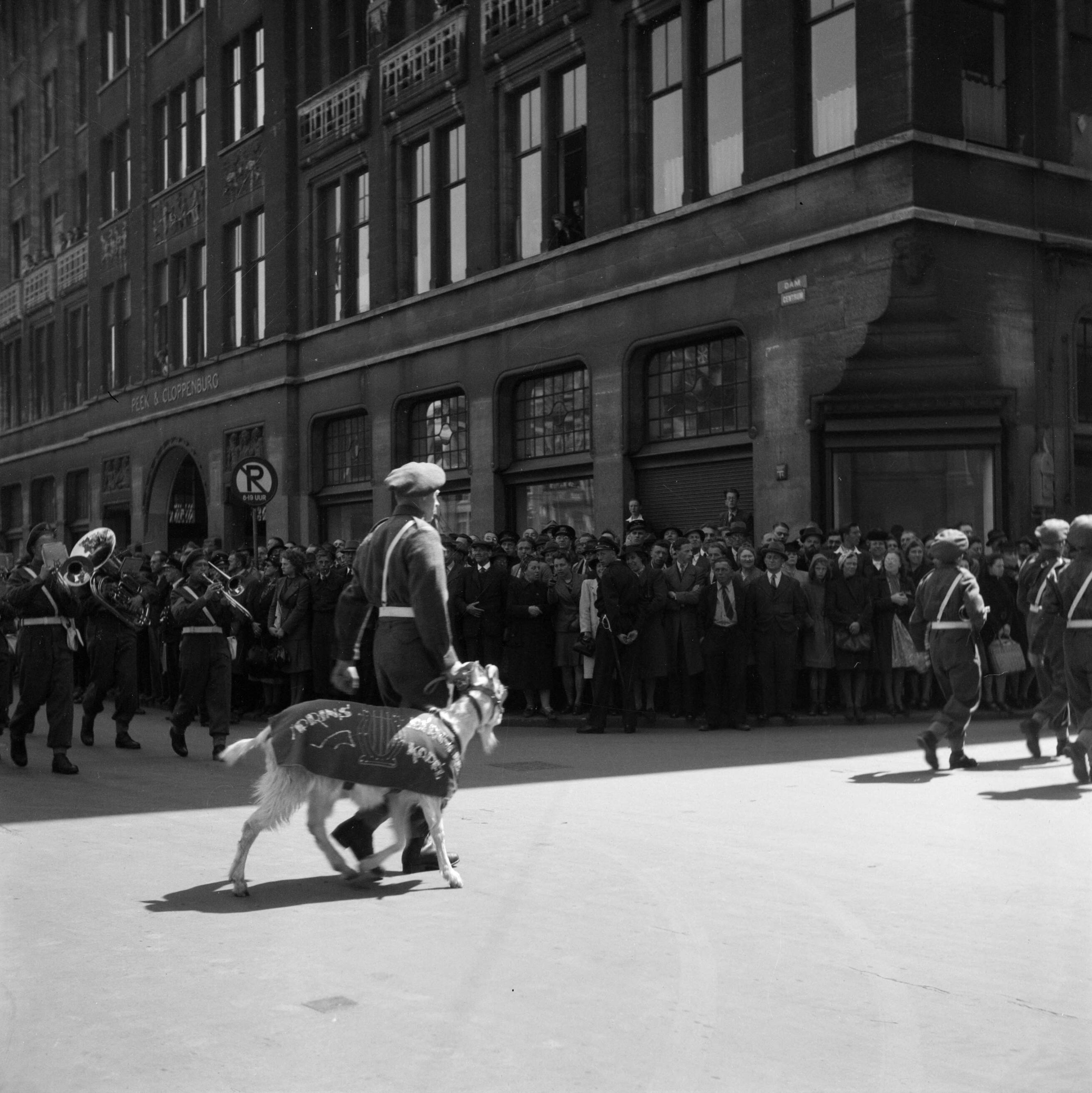 Leden van Prins Bernhardkapel marcheren langs toekijkend publiek, op de voorgrond de mascotte Kees de Bok