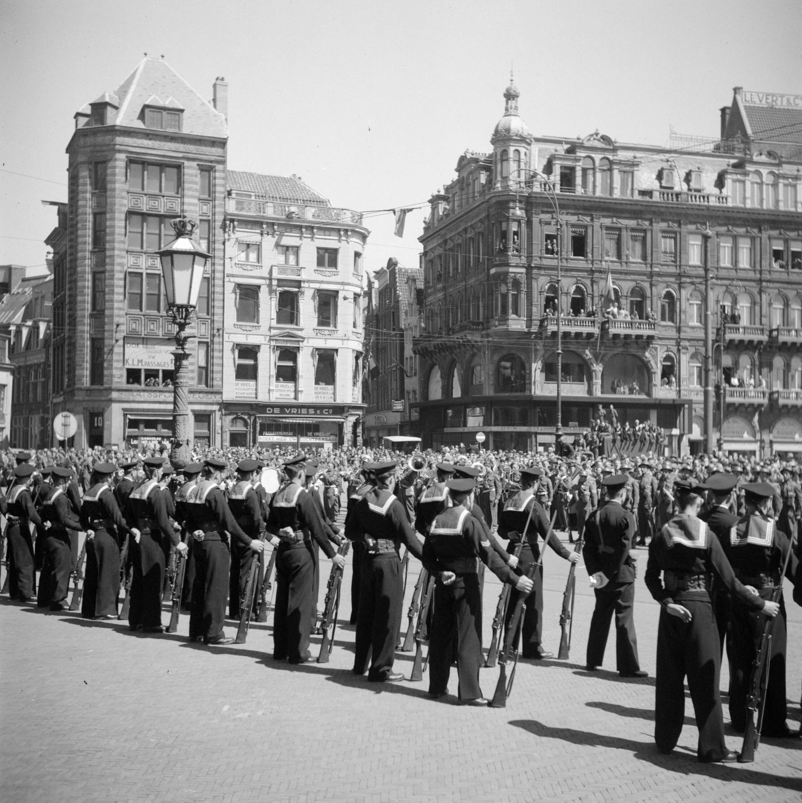 Leden van de Koninklijke Marine in het gelid voor het Koninklijk Paleis, op de achtergrond de ingang van de Nieuwendijk