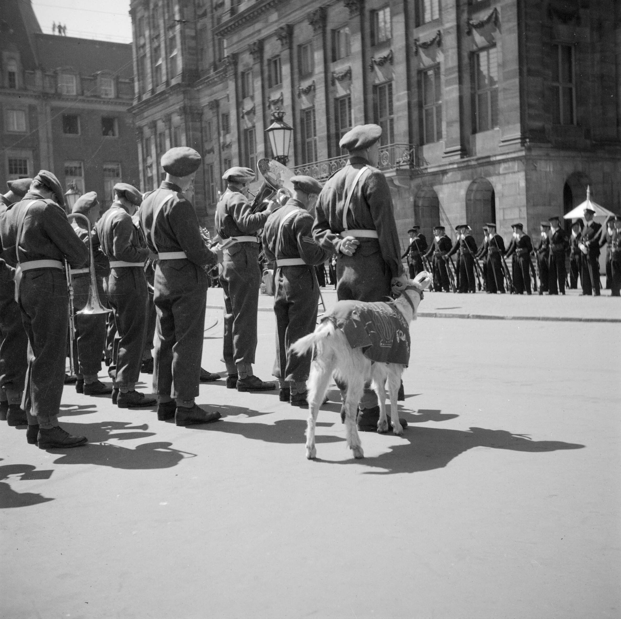 Leden van de Prins Bernhardkapel tijdens uitvoering voor het Koninklijk Paleis; op de voorgrond mascotte Kees de Bok