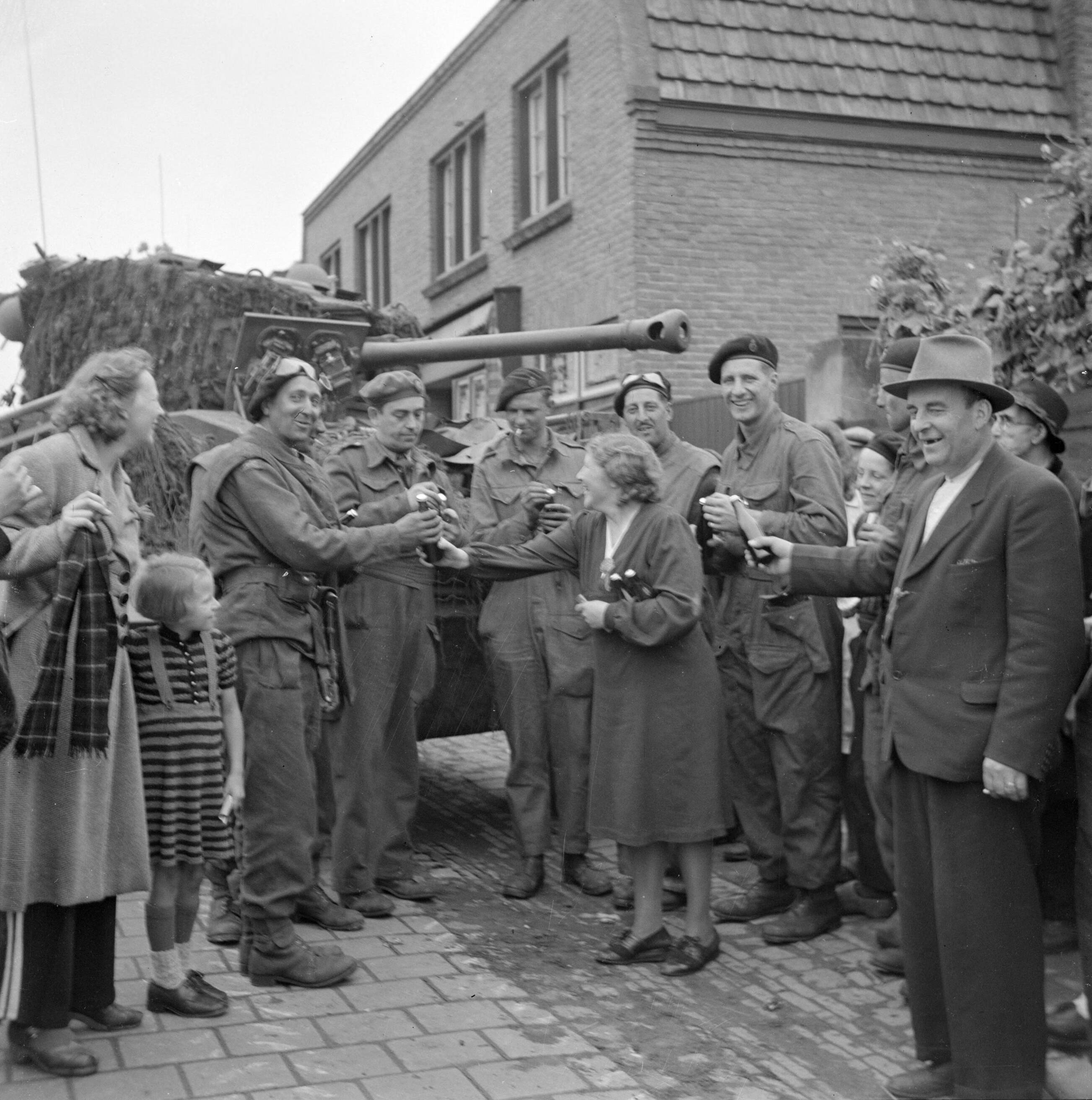 Inwoners van Aalst bieden militairen flessen drank aan, vermoedelijk aan soldaten van de Irish Guards