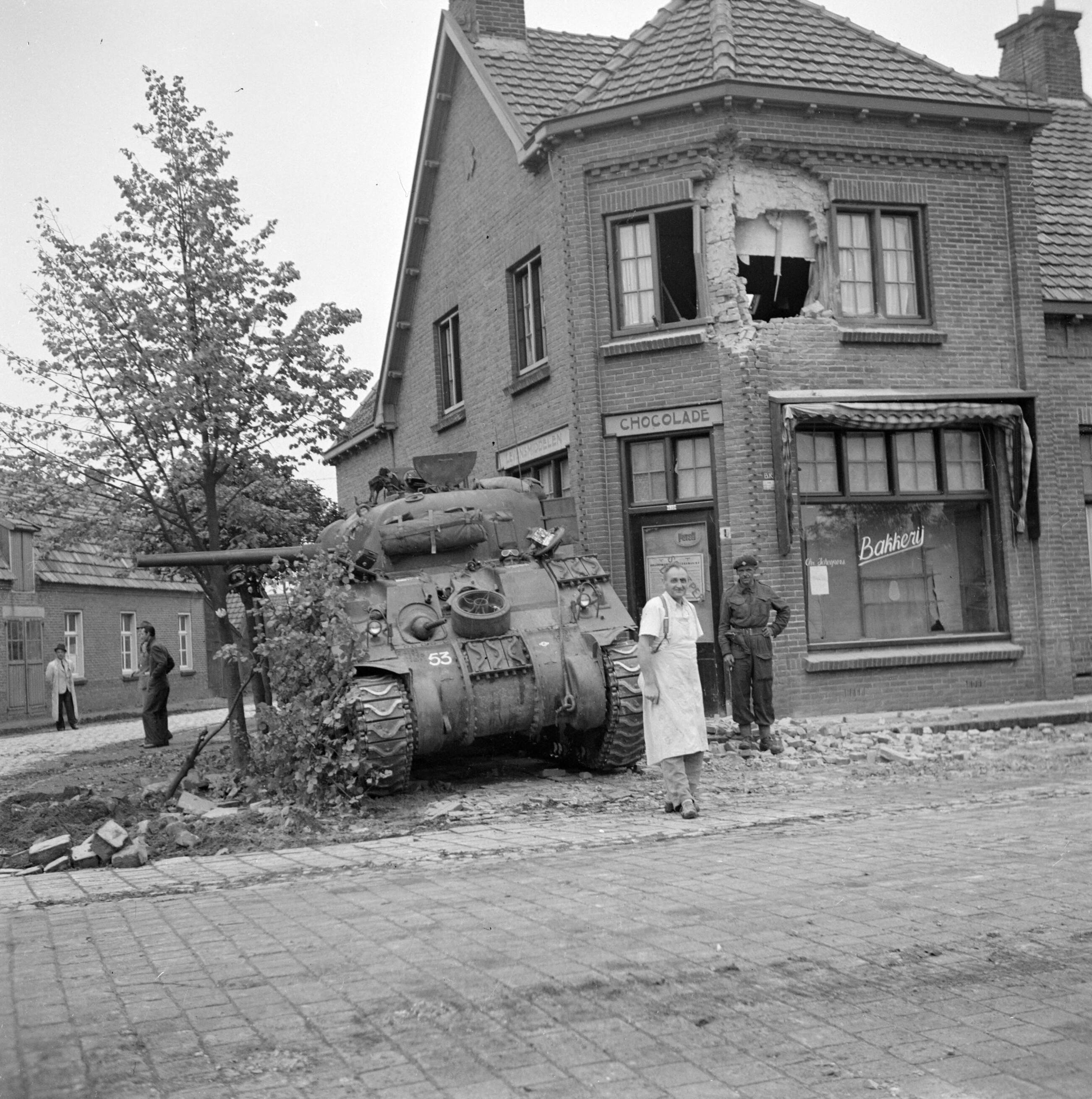Inwoner van Aalst poserend voor een tank van de Irish Guards bij een zwaarbeschadigde bakkerij