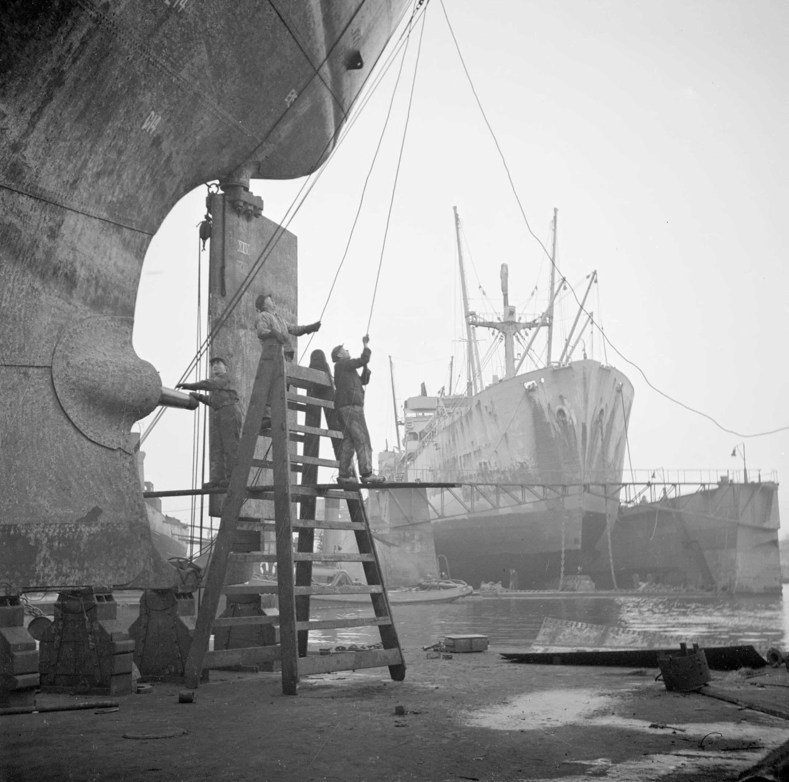 Scheepsreparatiewerf. Arbeiders op een trap bij een open plek voor een scheepschroef trekken aan lijnen