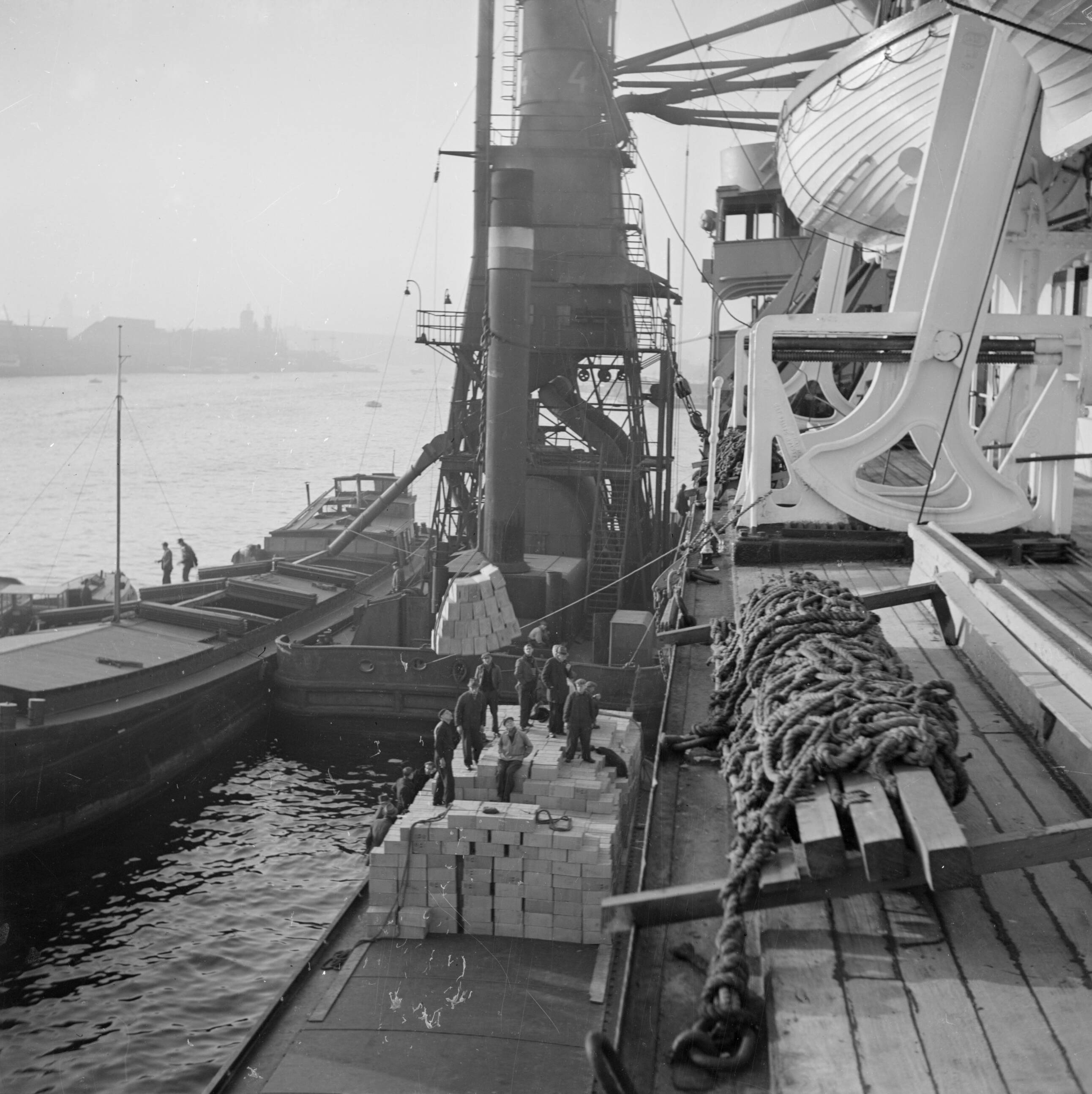 Graanelevator ligt naast vrachtschip, daarnaast binnenvaartschip