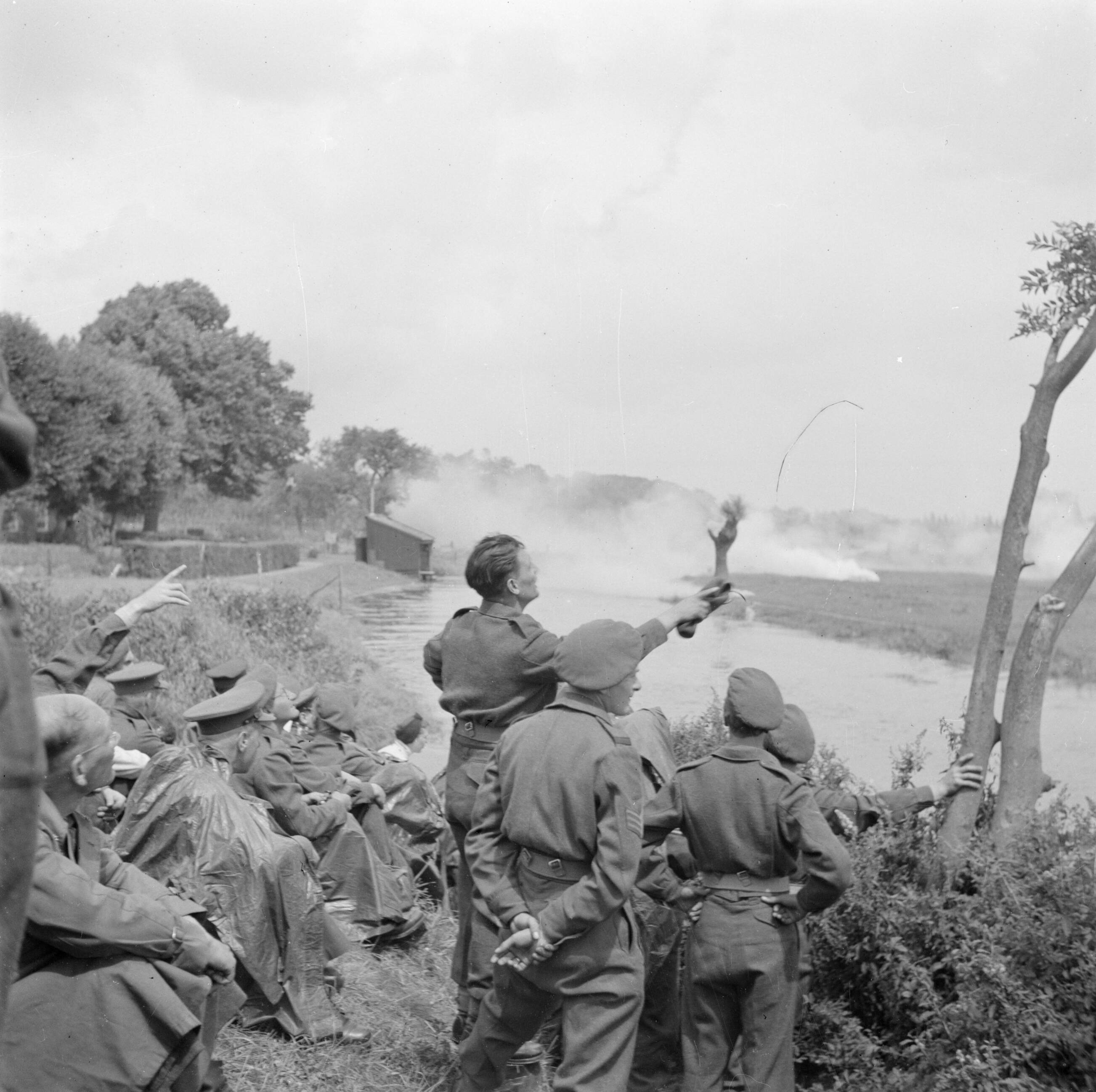 Een militaire oefening wordt vanaf een rivieroever door waarnemers bekeken