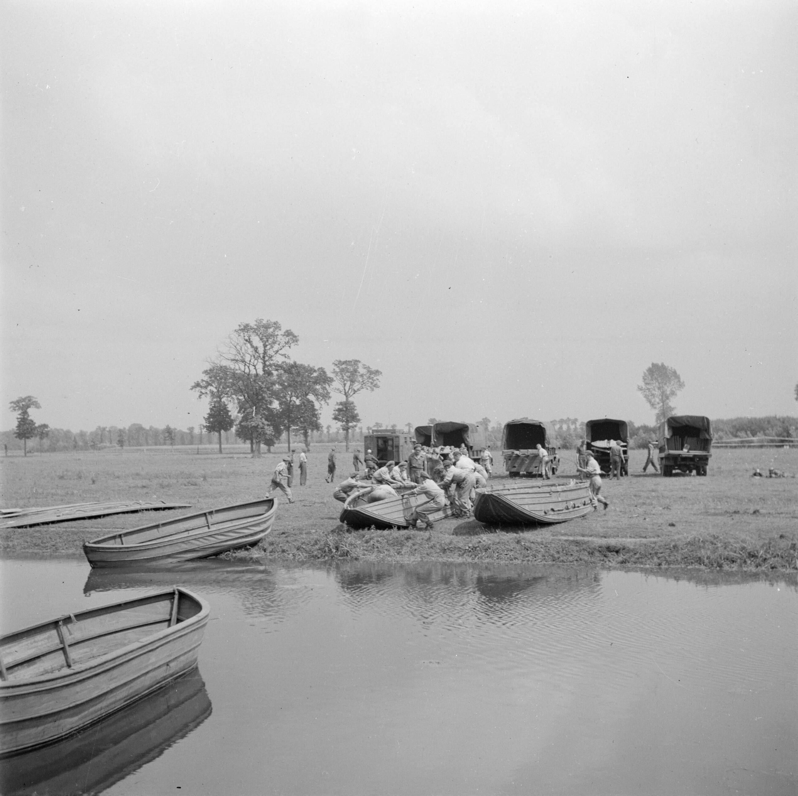 Een militaire oefening. Uitklapbare stormboten worden klaargemaakt