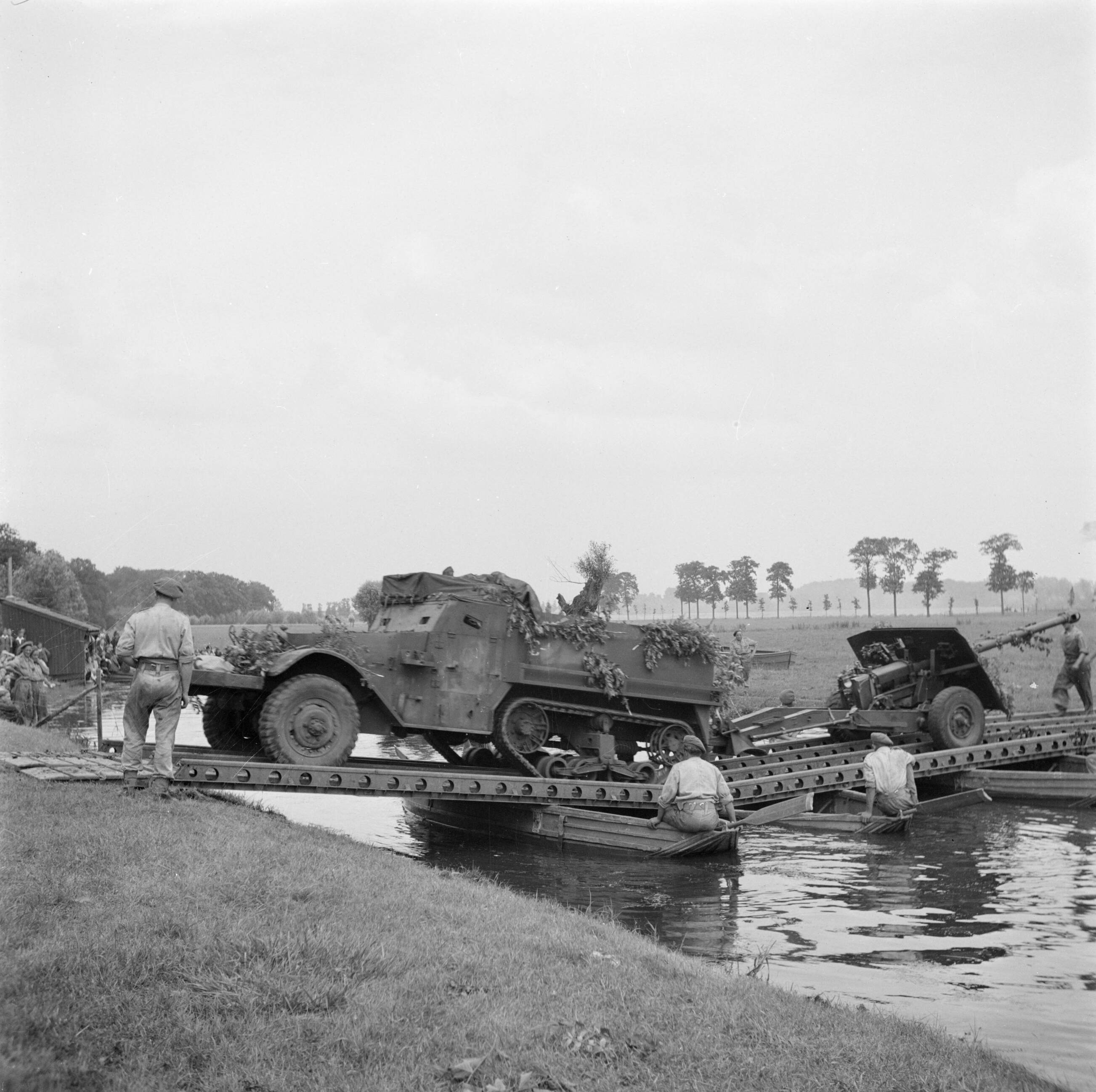 Een militaire oefening. Een rivier moet worden overgestoken. Een halftrack wordt via een pontonbrug overgezet