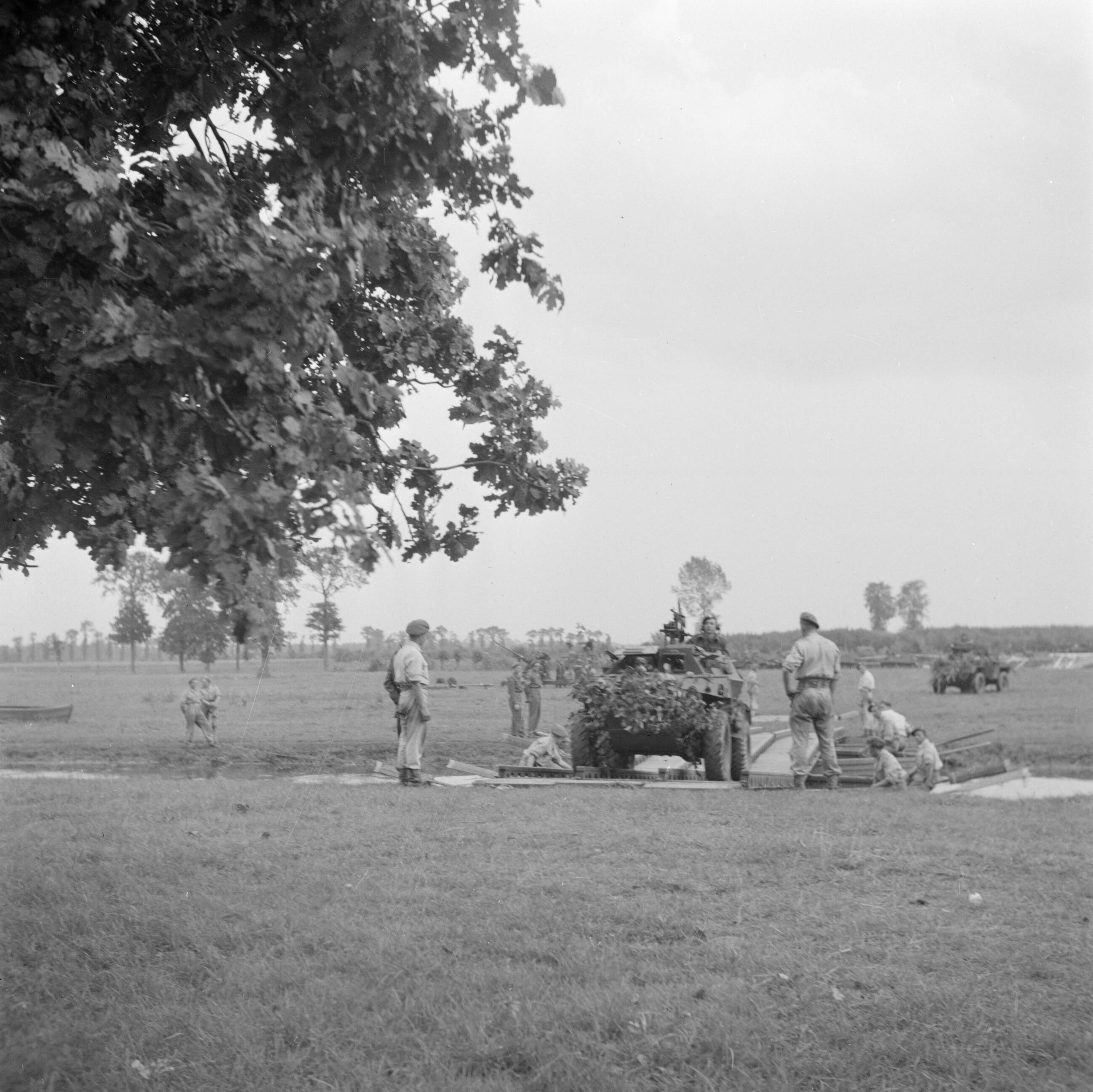Een militaire oefening. Een rivier moet worden overgestoken. Een Humber Scout Car passeert de pontonbrug