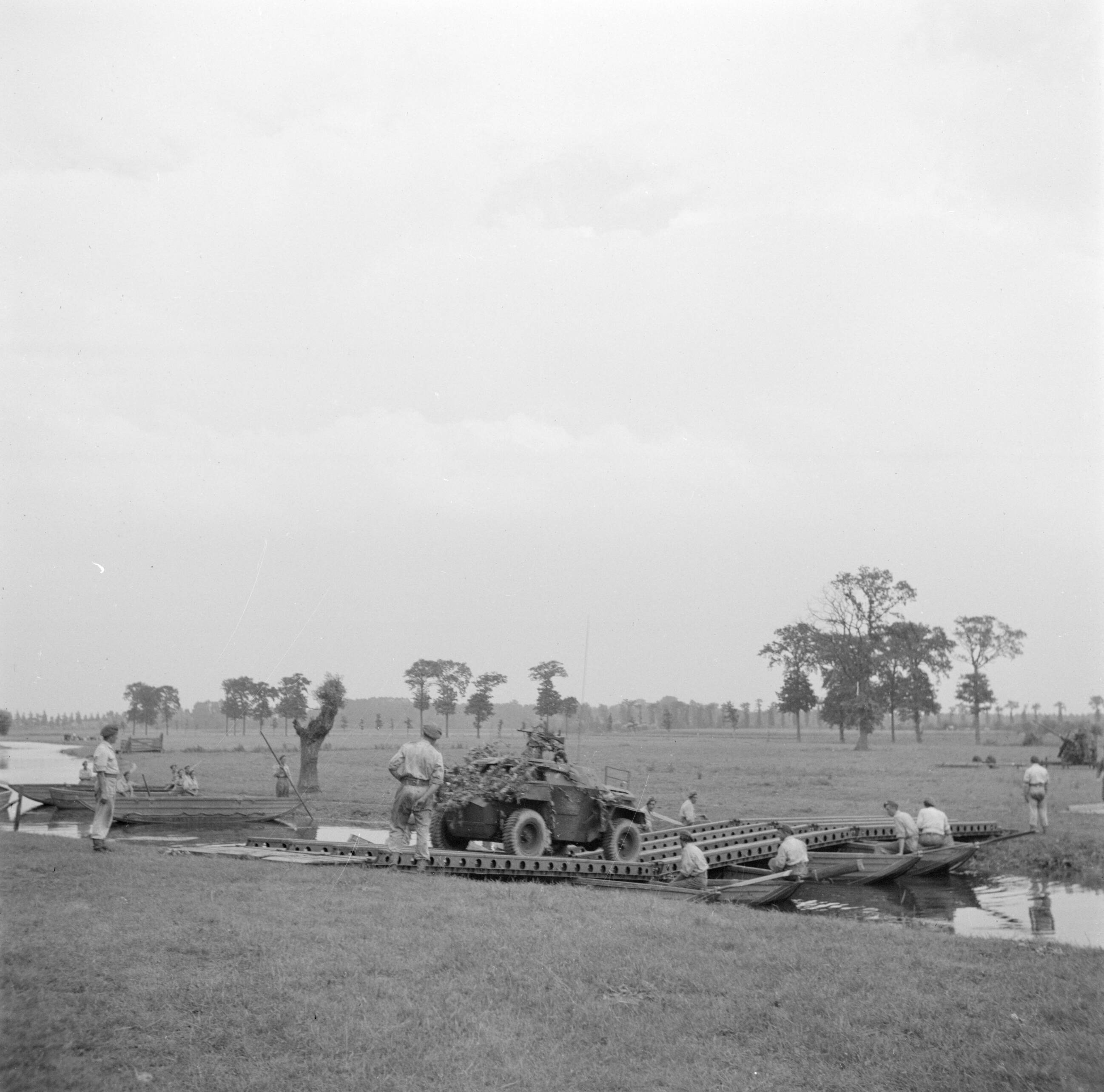 Een militaire oefening. Een rivier moet worden overgestoken. Een Humber Scout Car passeert de pontonbrug