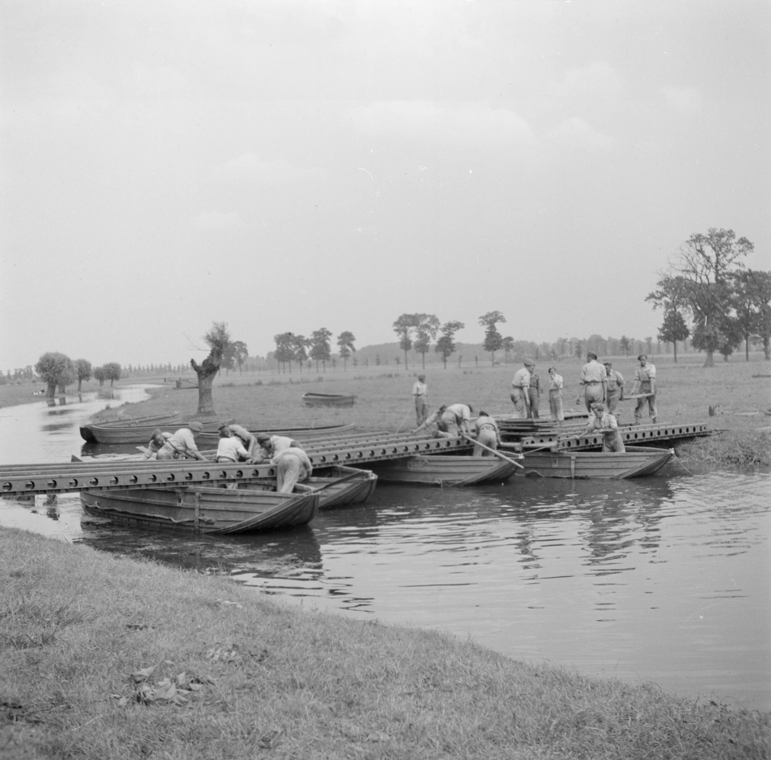 Een militaire oefening. Een rivier moet worden overgestoken. Een pontonbrug wordt aangelegd