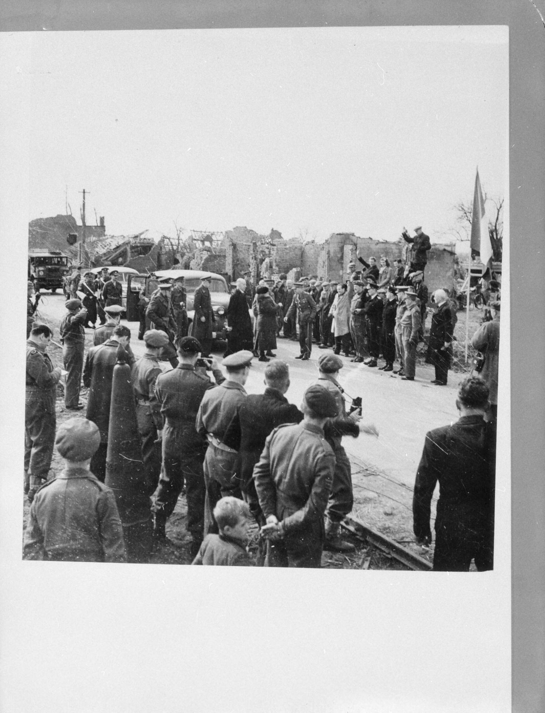 Koningin Wilhelmina zet voor het eerst weer voet op Nederlands grondgebied, door het passeren van de z.g. "Meelstreep" in Eede bij Aardenburg, Zeeuws-Vlaanderen