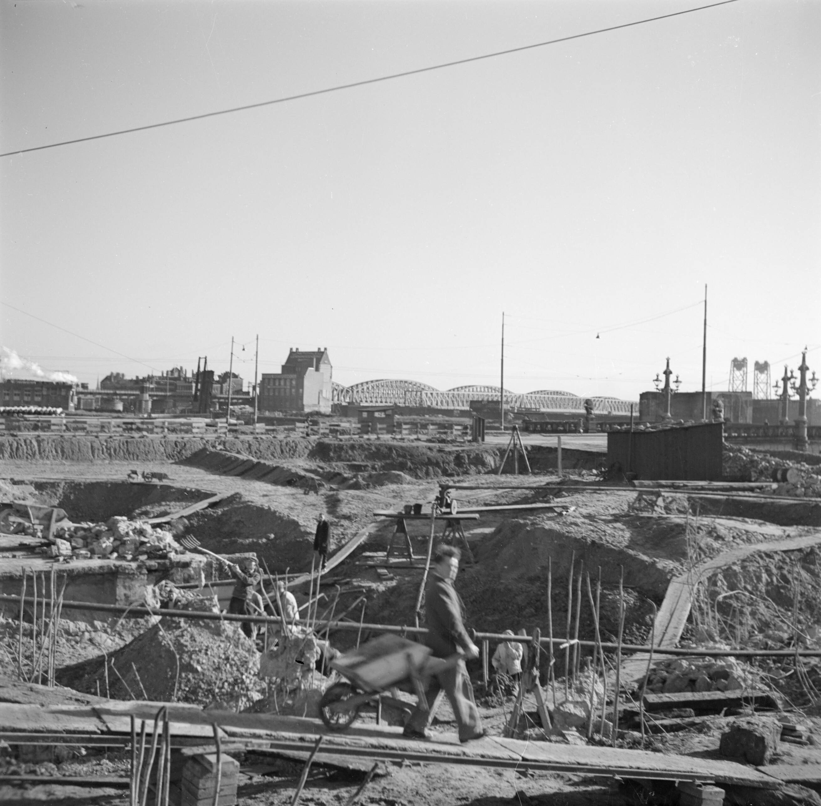 Bouwvakkers aan het werk in een bouwput; op de achtergrond de Maasbruggen en de Hef
