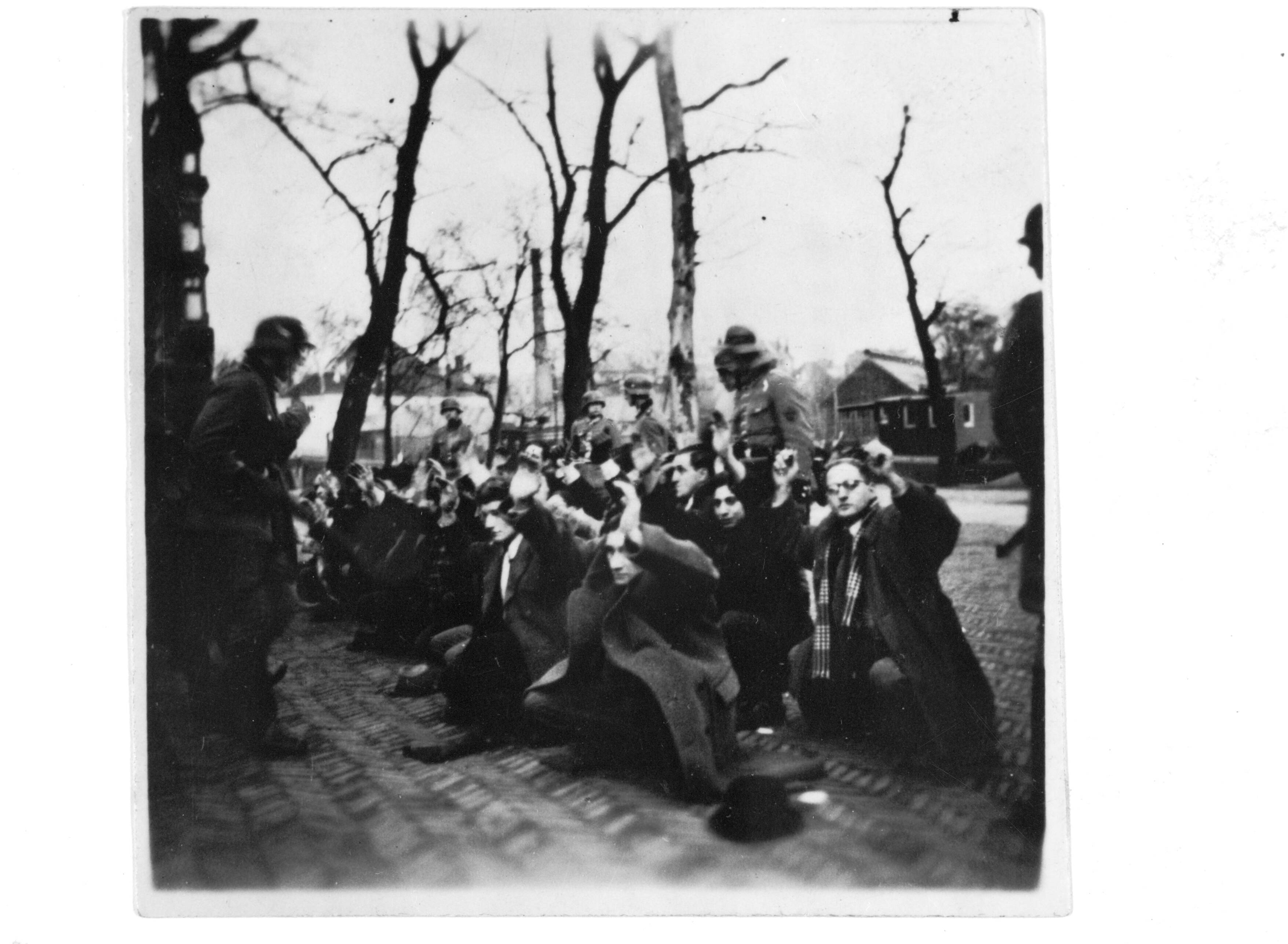 Foto van een foto van een groep mannen op hun kniëen bewaakt door Duitse soldaten