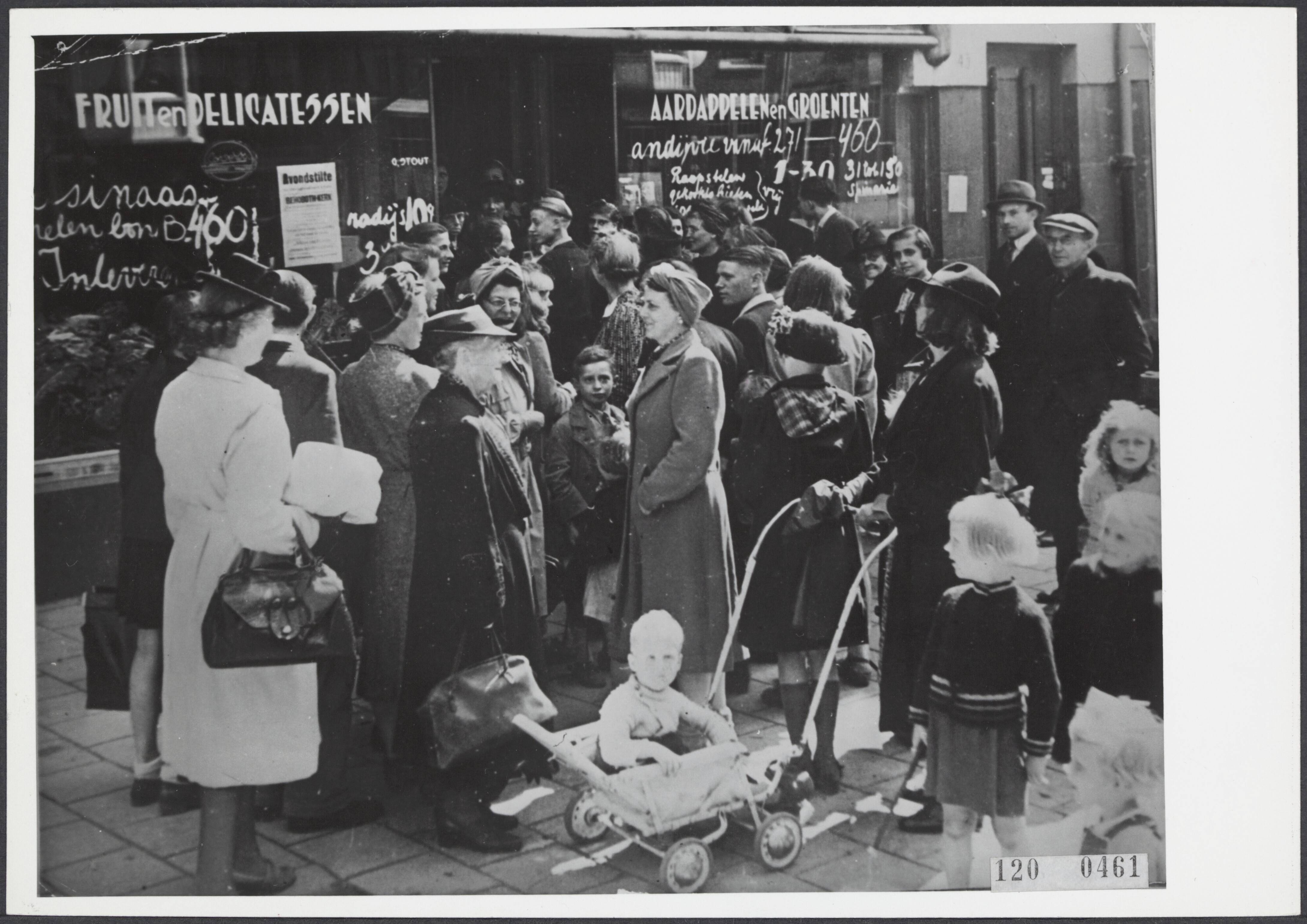 Distributie van levensmiddelen een grote groep mensen heeft zich verzameld voor een groentewinkel met opschriften op de ruiten