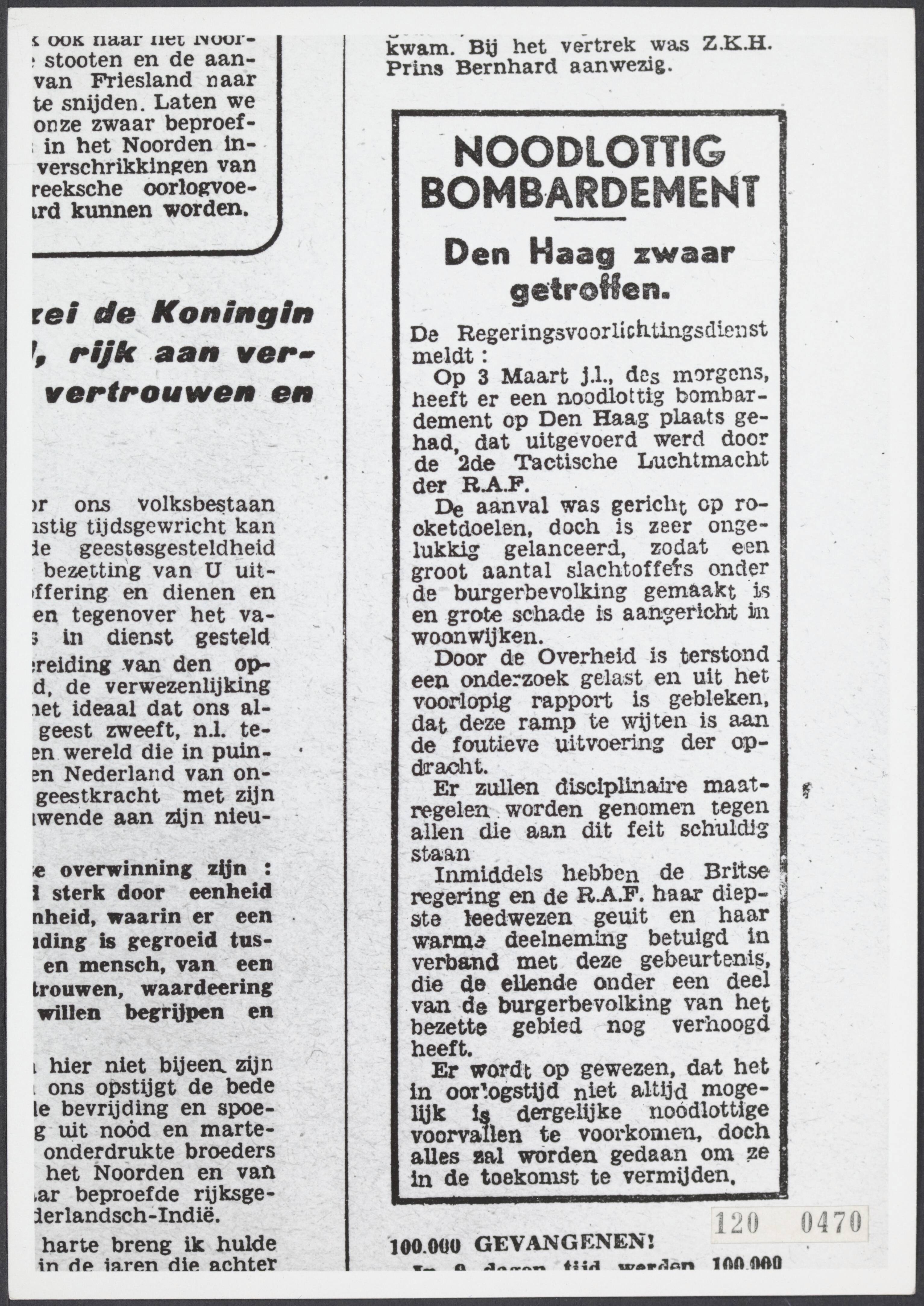 Krantenbericht over bombardement Bezuidenhout te Den Haag door de RAF