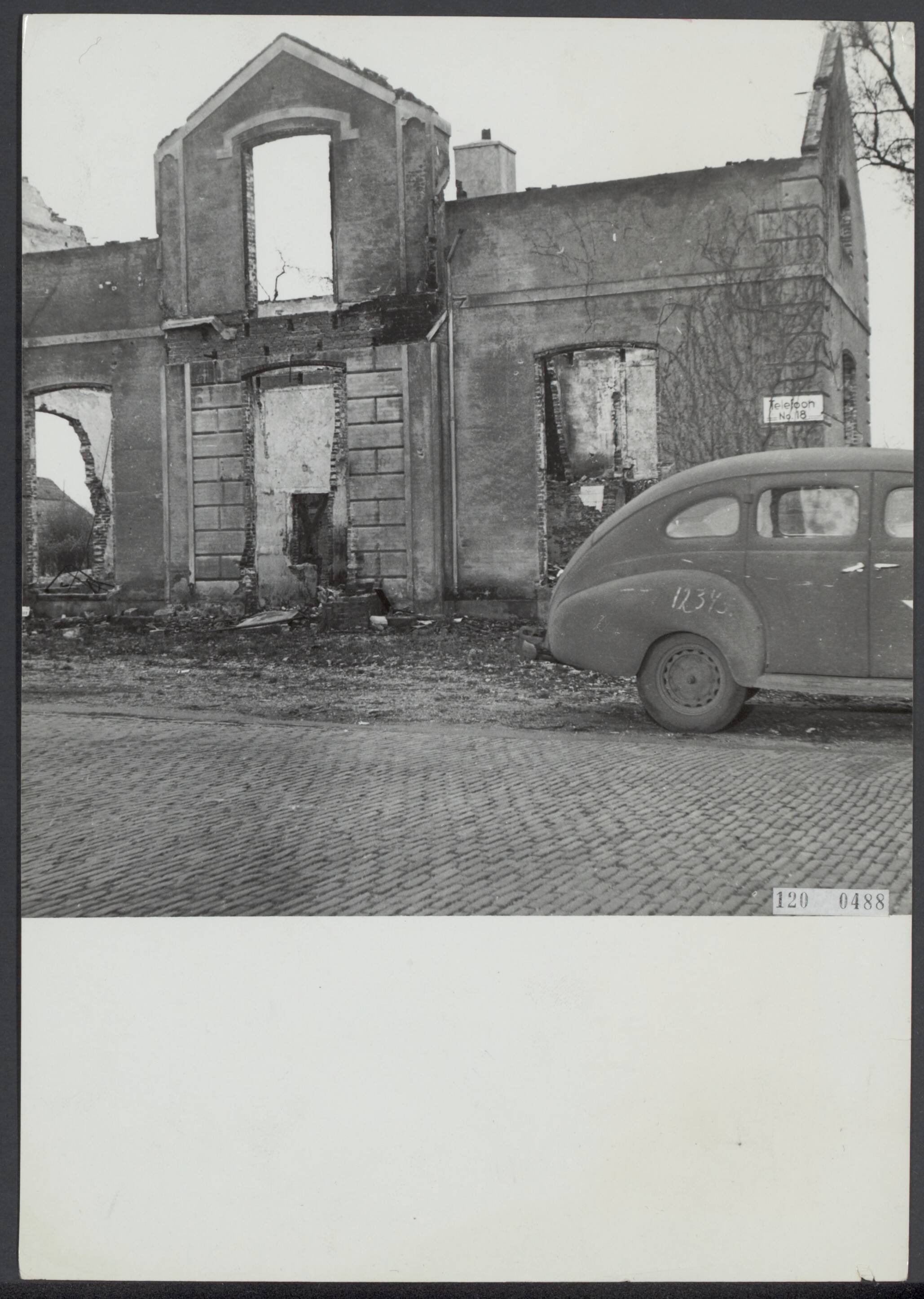 Een van de 105 huizen die door de Duitsers in brand zijn gestoken als repressaillemaatregel voor een aanslag op een Duitse militai...
