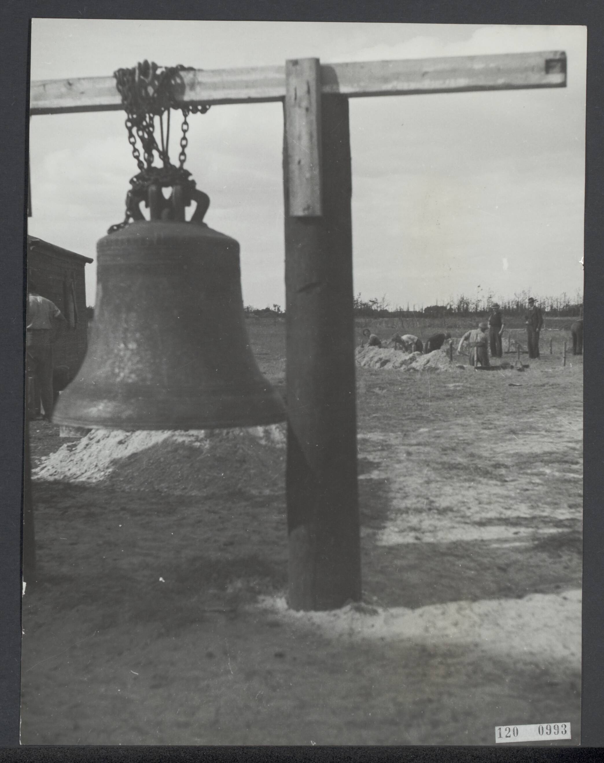 Kerkklok wachtend op herbouw van een tijdens WO II verwoeste toren locatie onbekend.