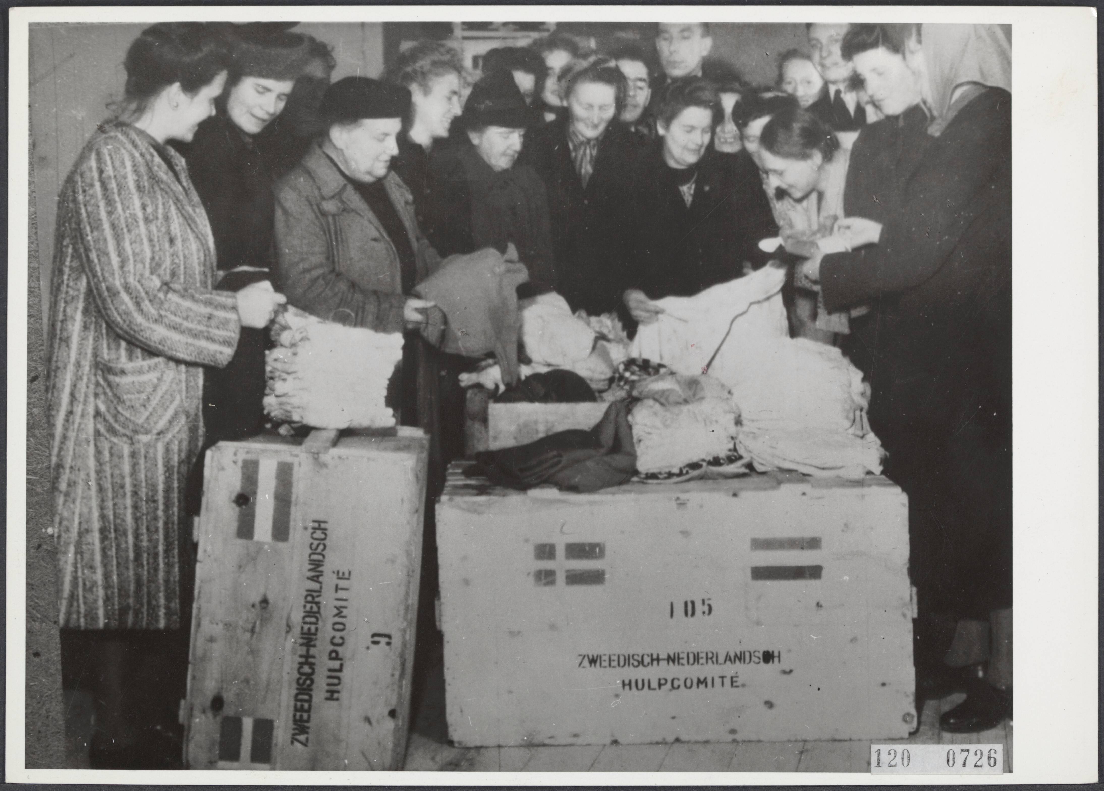 Uitreiking van textiel van het Zweeds-Nederlands Hulpcomité aan het eind van de hongerwinter in Holland