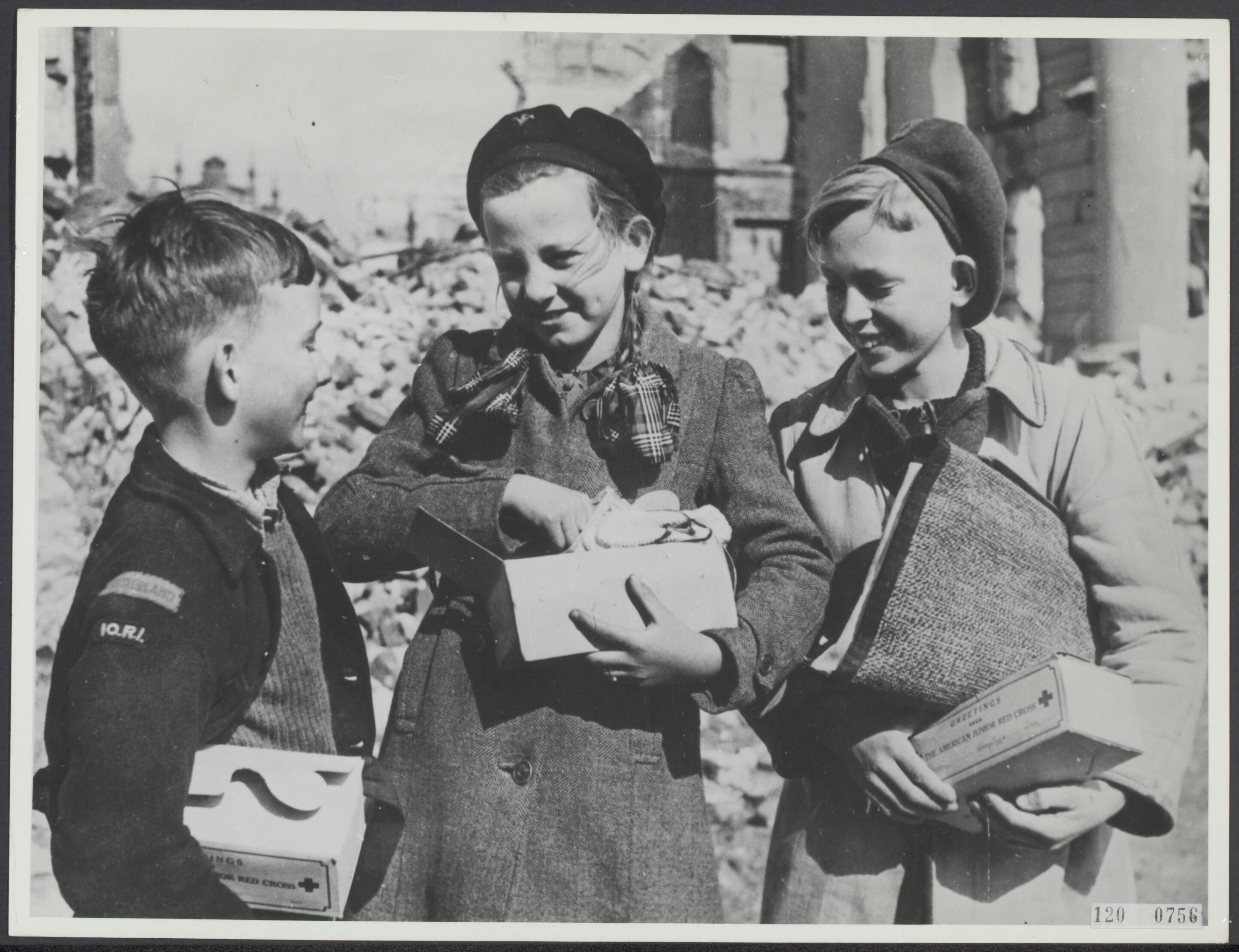 Bevrijding. Schoolkinderen helpen het Rode Kruis bij distributie van voedselpakketten