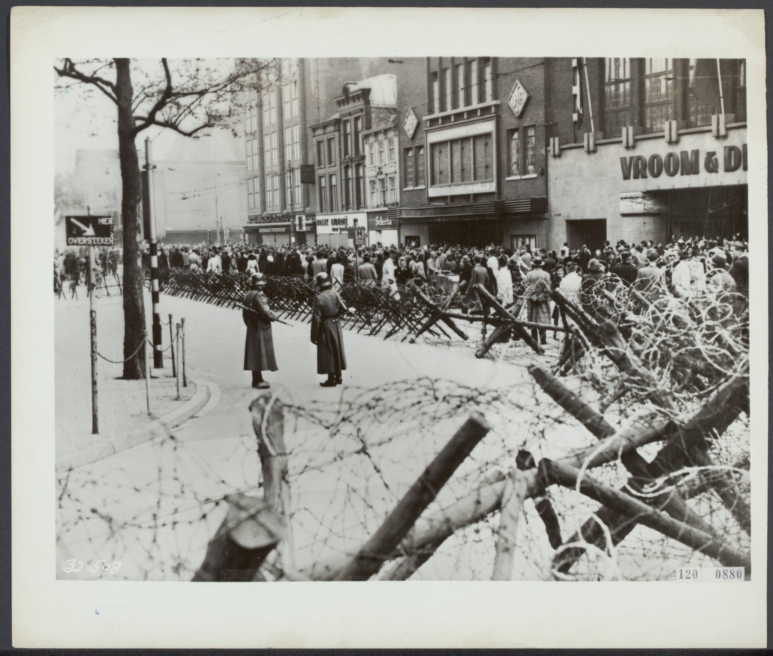 Bevrijding. Den Haag. Bevolking viert feest terwijl nog bewapende Duitsers toekijken