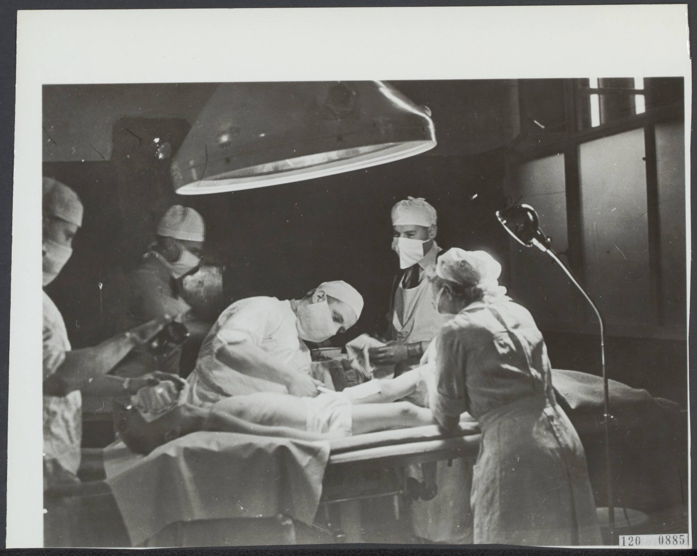 Bevrijding van Nederland. Nederlands kind, gewond bij een Duitse aanval op een stad in Zuid-Nederland, wordt geopereerd door een RAF chirurg in een mobiel veldhospitaal