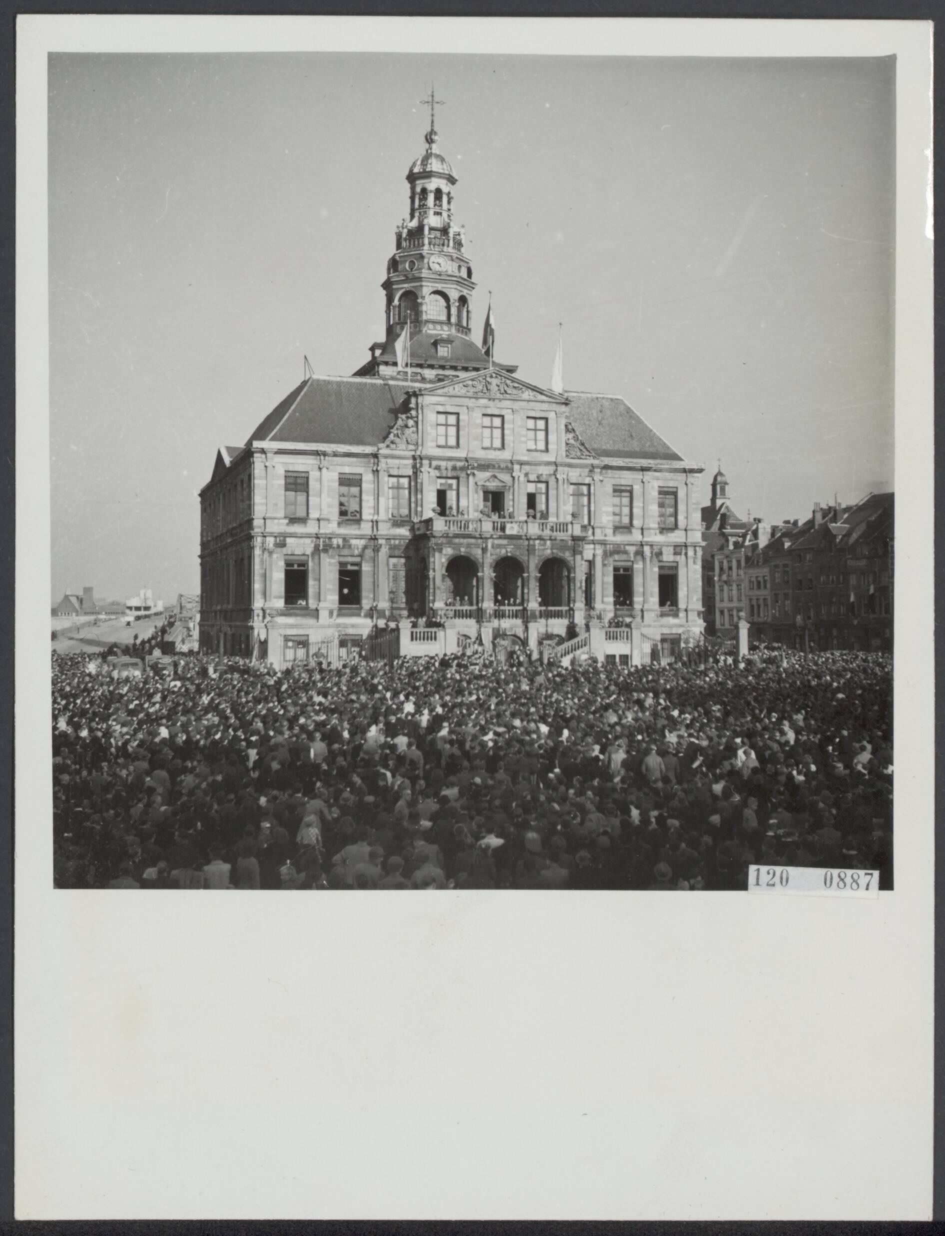Bevrijding. Koningin Wilhelmina wordt toegejuicht door de samengestroomde bevolking op het plein voor het stadhuis van Maastricht
