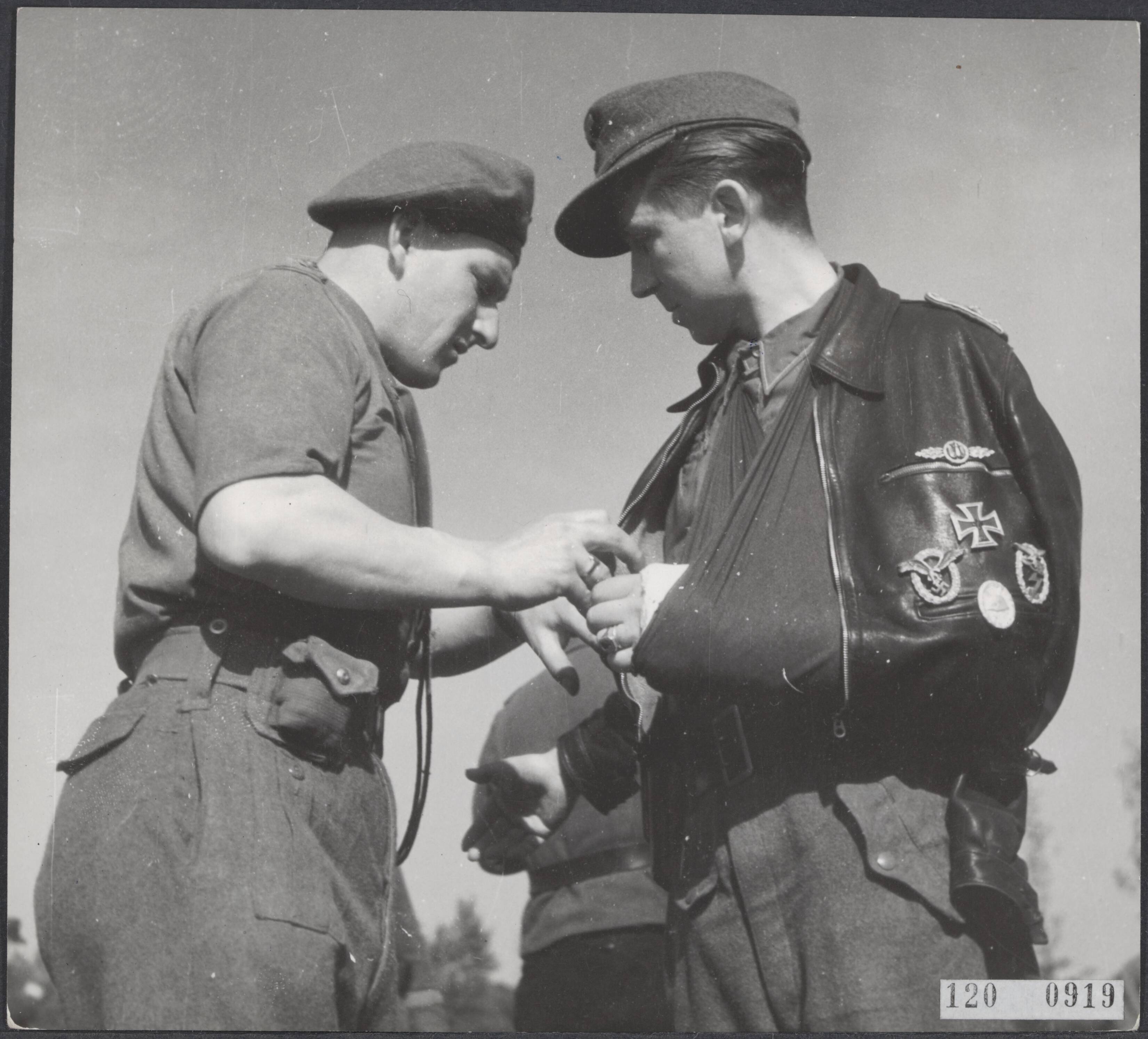 Reportage uit het wapendepot in Soest, waar de Duitsers hun wapens moeten inleveren. Gewonde Duitse piloot met hoge onderscheidingen wordt onderzocht door Britse soldaat op de ontwapeningvelden in Soest
