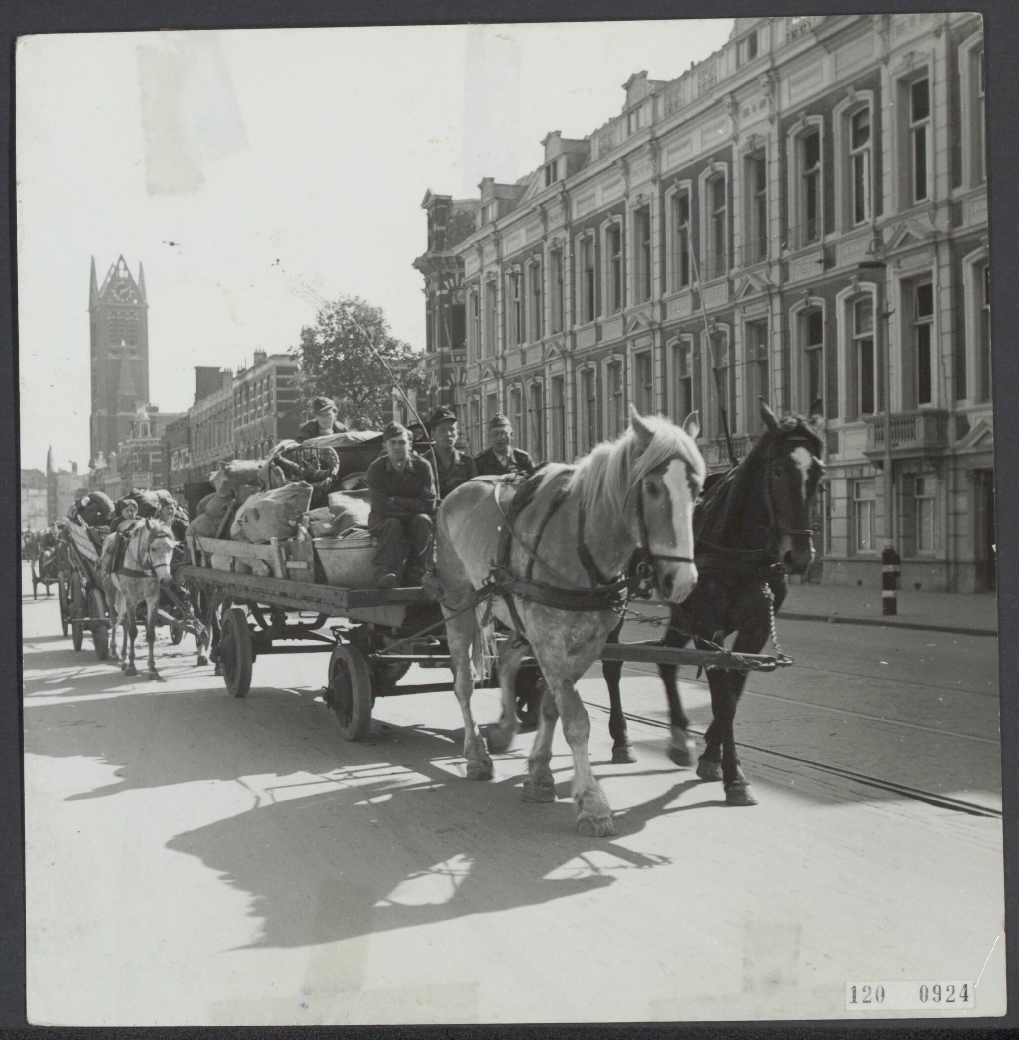 Duitse krijgsgevangen, met alleen nog persoonlijke bezittingen, worden op sloperswagens uit den Den Haag afgevoerd