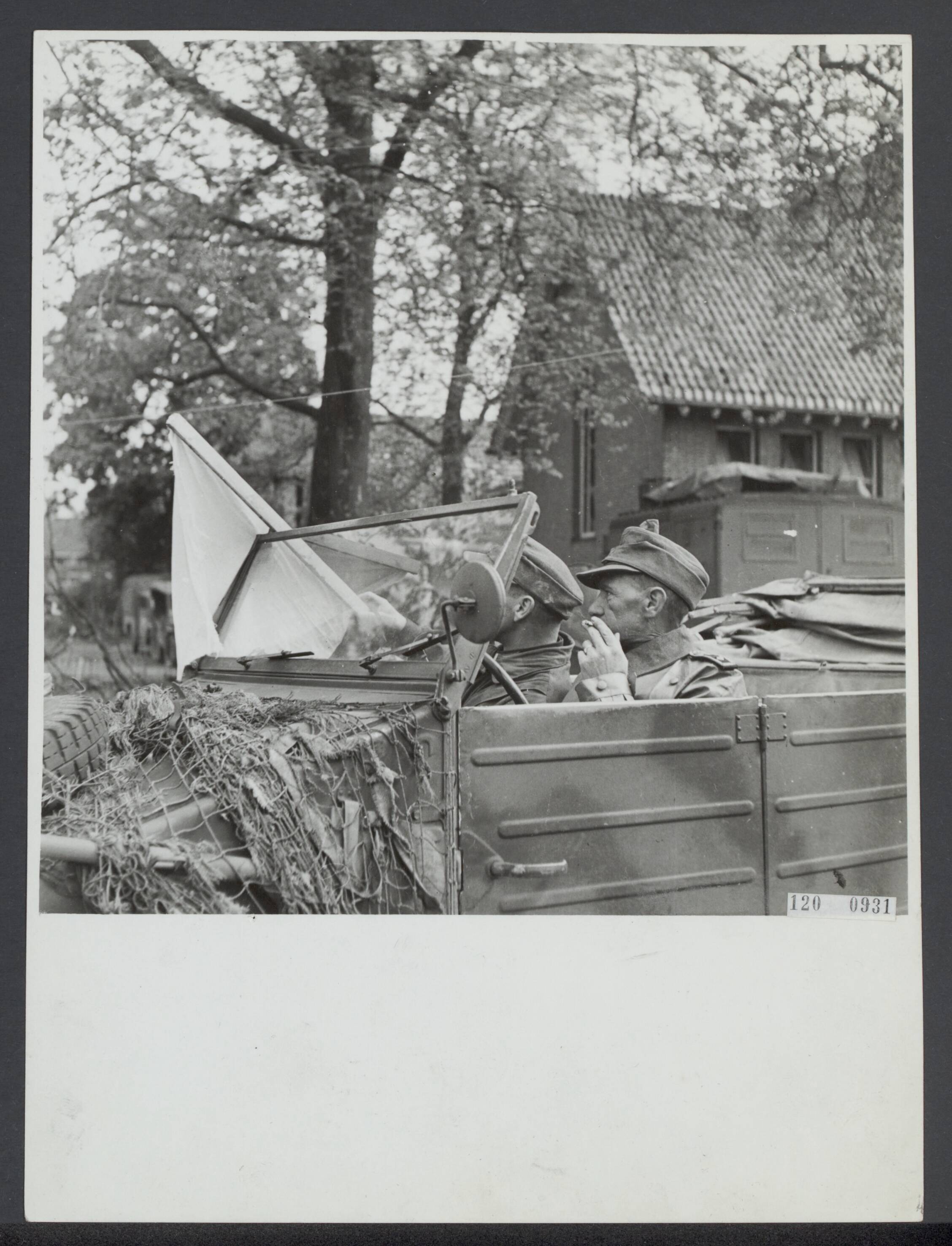 Voorbereidingen en onderhandelingen tot de capitulatie in Wageningen. Kubelwagen met Duitse onderhandelaars met witte vlag