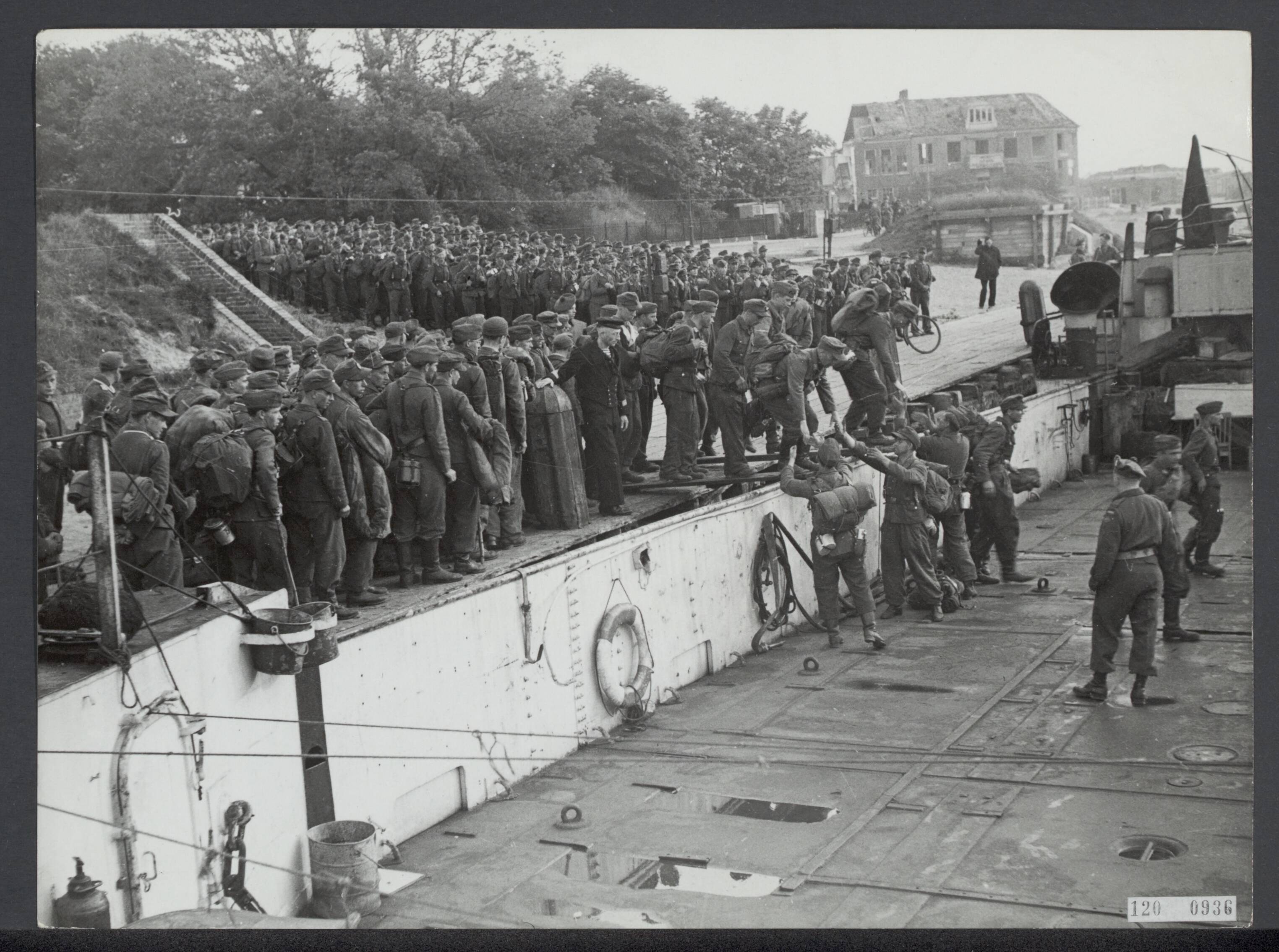 In Den Helder worden de ontwapende Duitse soldaten in LCT boten ingescheept voor Harlingen, vanwaar te voet de lange reis naar de "Heimat" wordt afgelegd.