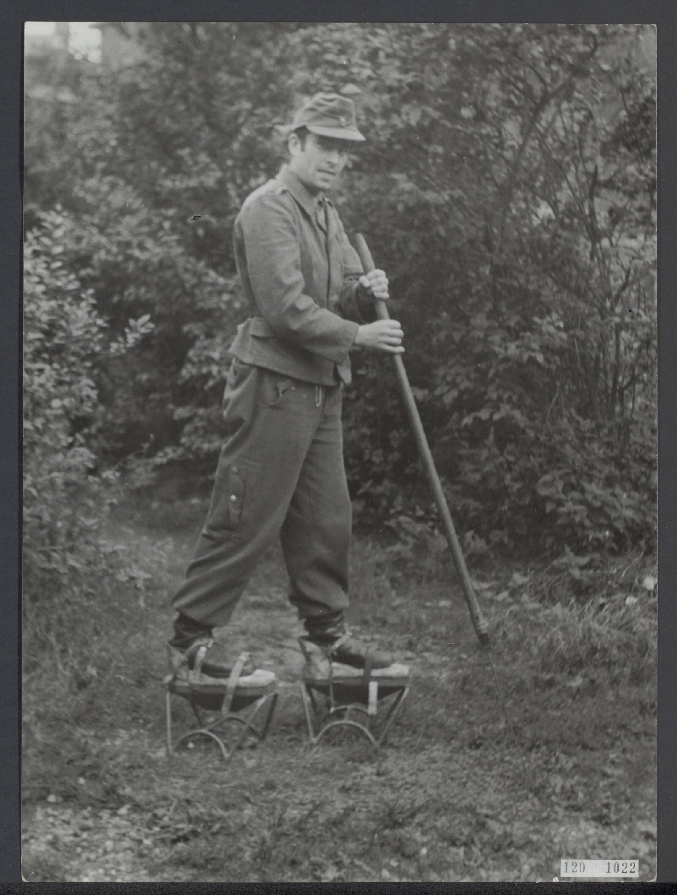Opruimen van landmijnen bij Hoek van Holland. Duitse krijgsgevangen worden daarbij ingezet. De speciale schoenverhogingen zijn van Duitse makelij