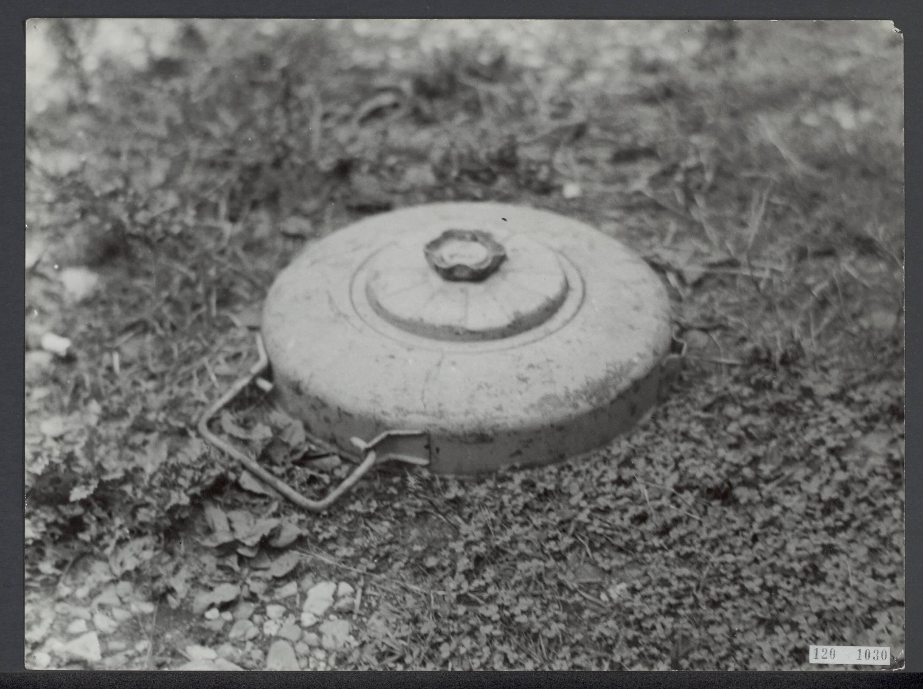 Opruimen van landmijnen bij Hoek van Holland. Een Duitse landmijn