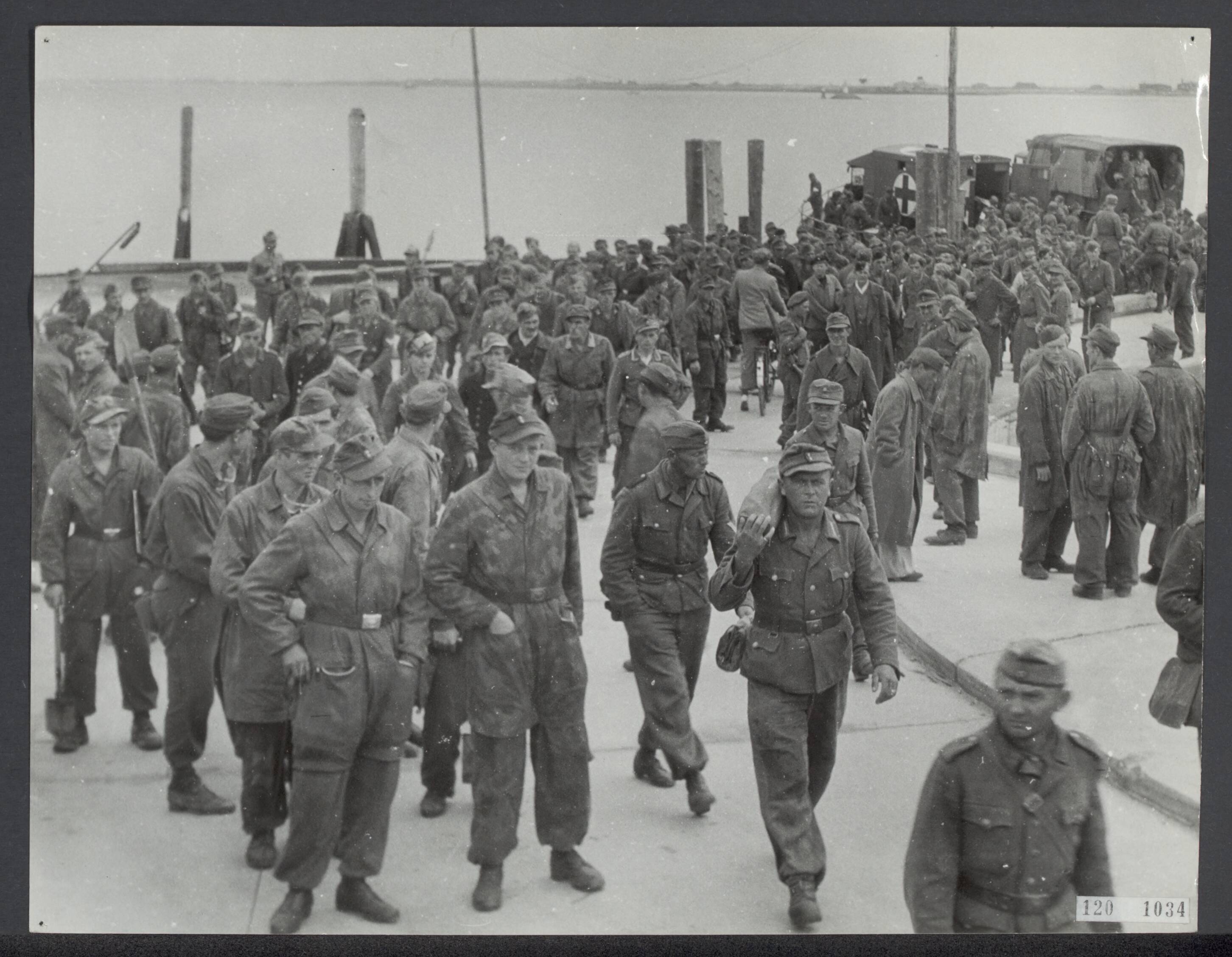 Landmijnen ruimen bij Hoek van Holland. Na het werk keren de Duitse krijgsgevangenen weer terug naar hun barakken