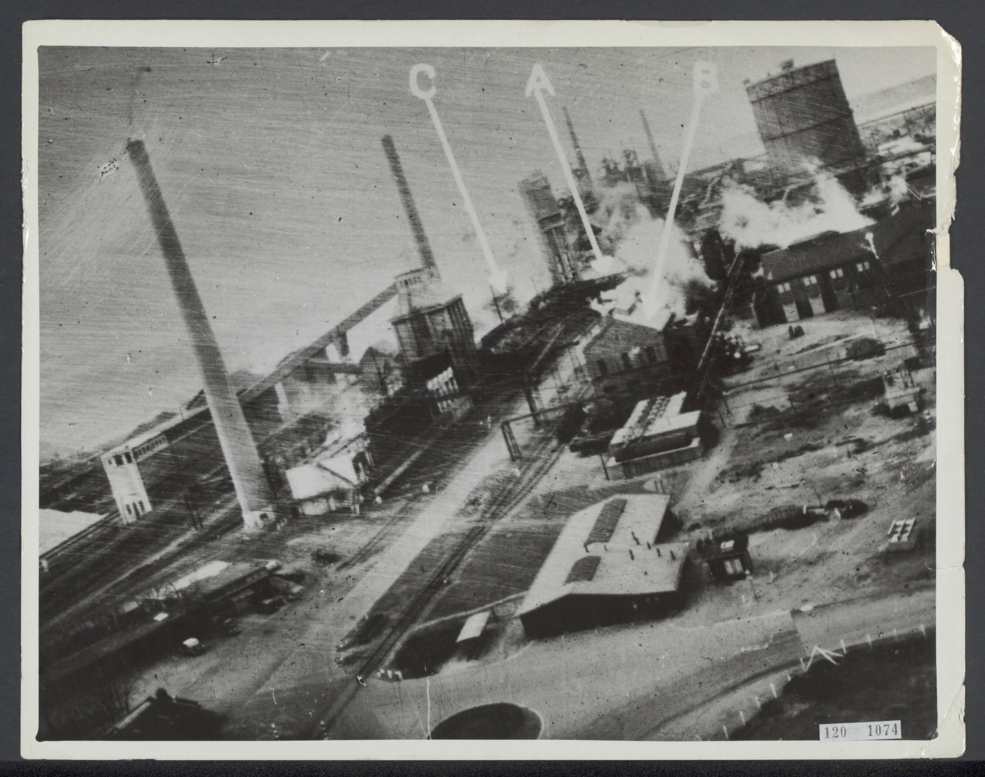 Twee ongeescorteerde Douglas Bostons van het 107 Squadron van de RAF bombarderen tijdens een dagaanval installaties van Hoogovens in Velsen. Te zien is (A) rook van een inslag bij een cokes-oven, (B) ontploffende bommen tussen de de tanks van een benzel bijproduct fabriek, (C) waarschijnlijk ontploffing bij de basis van een transportkraan