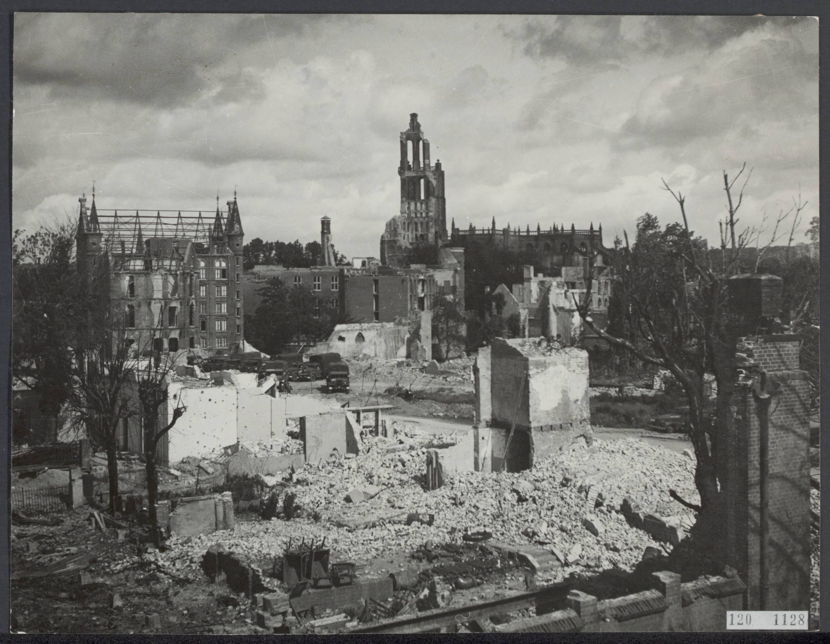 Verwoestingen Arnhem. Gezicht op de Markt. Op de achtergrond de Grote- of St. Eusebiuskerk. Links het Rijksarchief