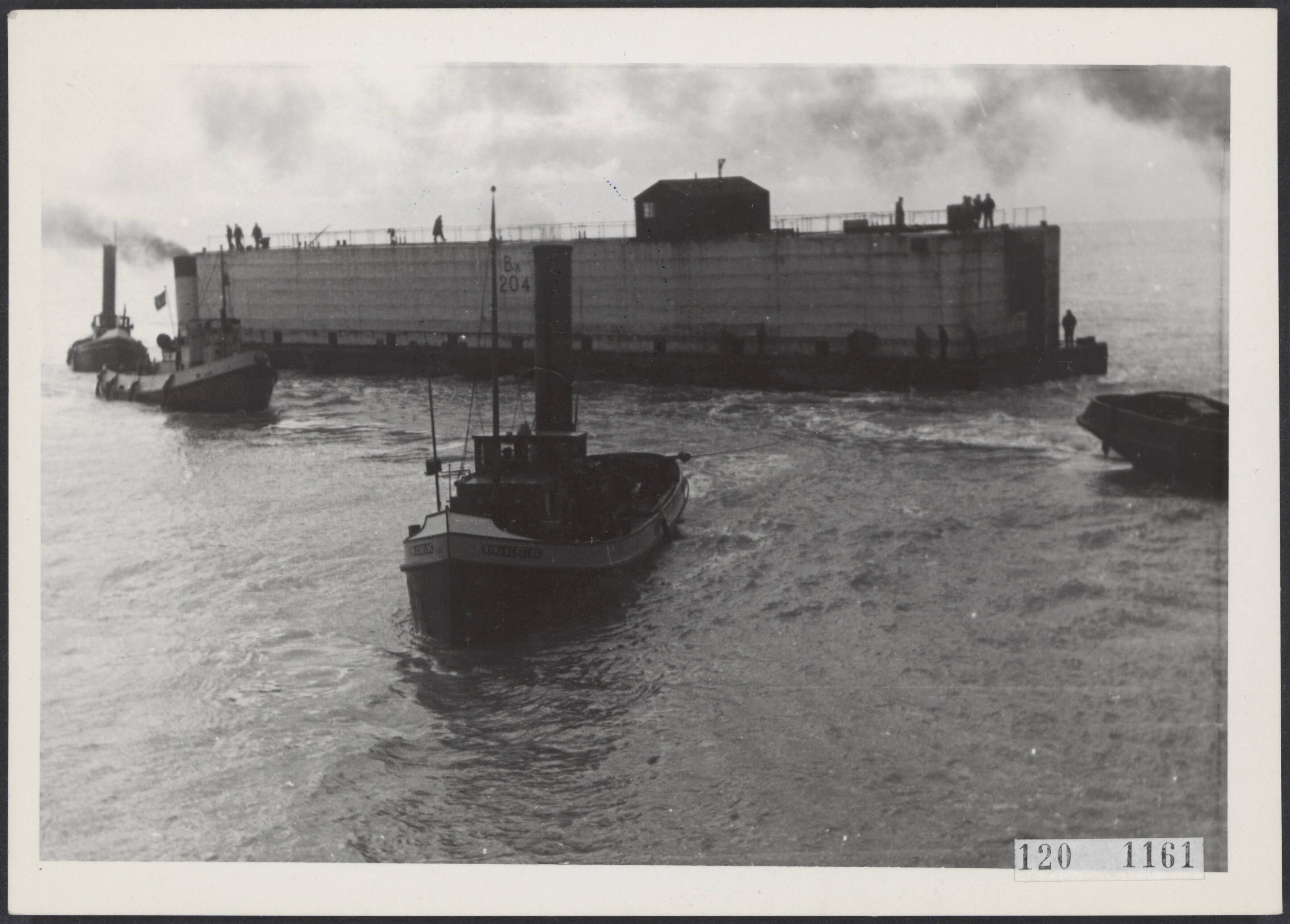 Herstelwerkzaamheden Westkapelle. Caissons voor dijkbouw worden gesleept bij Fort Rammenkens