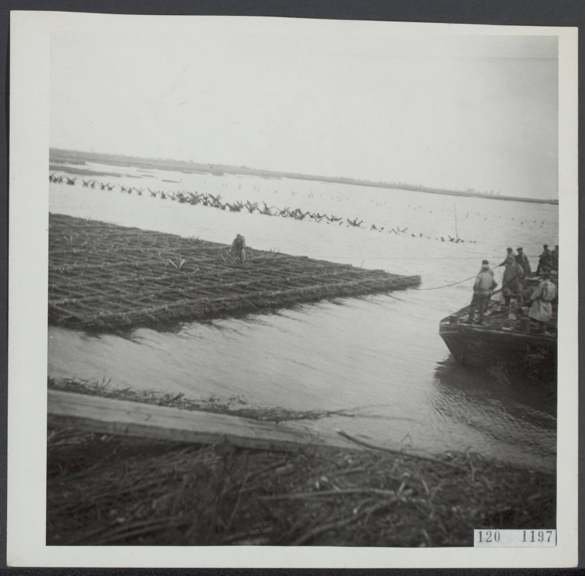 Herstelwerkzaamheden Walcheren. Rammekens. Horren van rijshout worden afgezonken waar een gat is te dichten in de dijk
